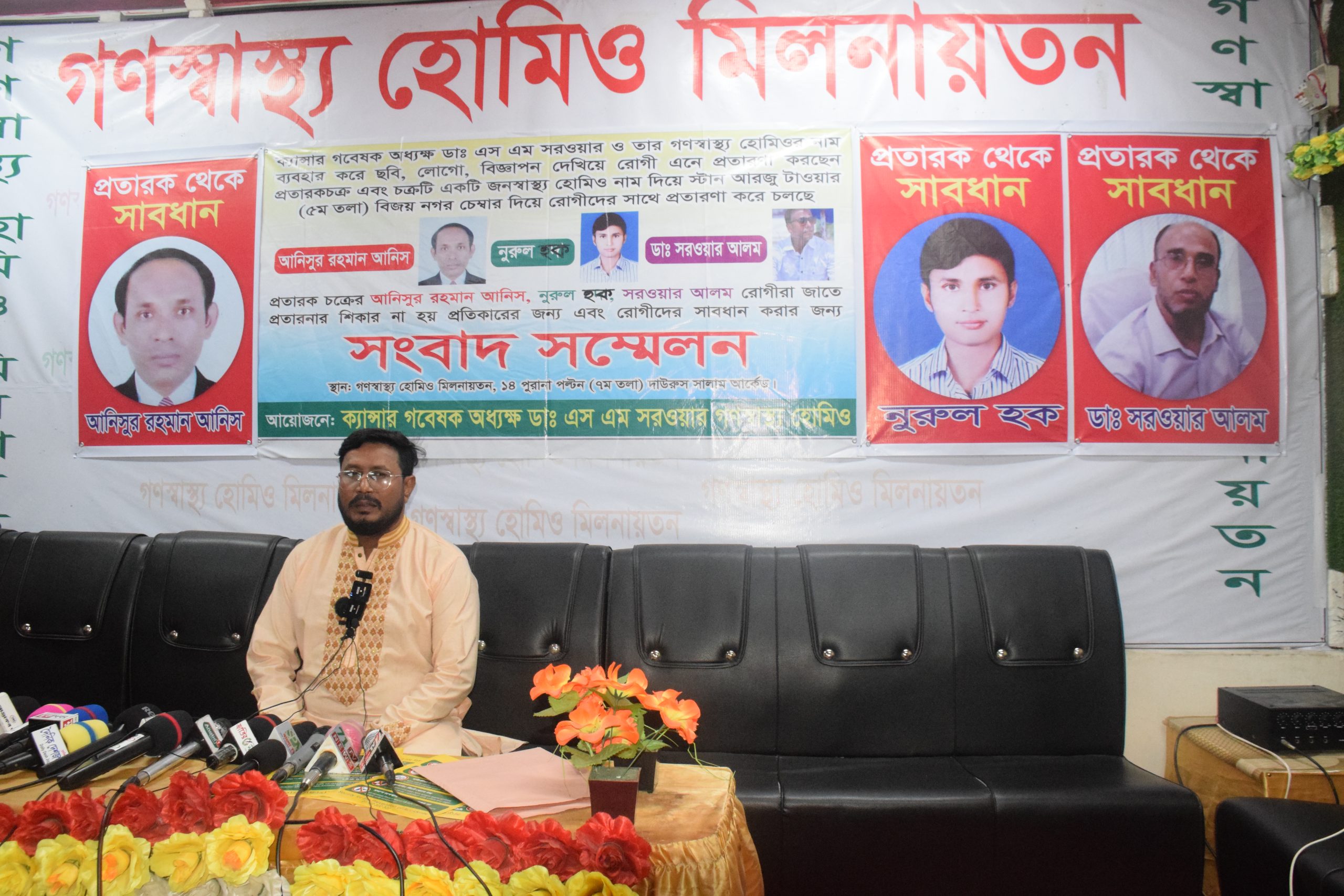 নিজস্ব প্রতিবেদকঃ ৭ মে বেলা ১২টায়, ১৪,পুরানা পল্টন দারুস সালাম আর্কেট ৭ম তলায়, গণস্বাস্থ্য হোমিও মিলনায়তনে প্রতারকদের কাছ থেকে রোগীদের সাবধান থাকার জন্য সংবাদ সম্মেলন অনুষ্ঠিত হয়। ক্যান্সার গবেষক ও ক্যান্সার চিকিৎসক, অধ্যক্ষ ডাঃ এস এম সরওয়ার এর প্রতিষ্ঠান গণস্বাস্থ্য হোমিও দীর্ঘ ২৭ বছর যাবত সুনামের সাথে ক্যান্সার চিকিৎসাসহ বিভিন্ন চিকিৎসা সেবায় কৃতিত্বের সাথে অবদান রেখে আসছেন। তারই ধারাবাহিকতায় ডা. সরওয়ার ও তার প্রতিষ্ঠানের সুনাম নষ্ট করার জন্য একটি প্রতারক চক্র ইস্টান আরজু টাওয়ার (৫ম তলা) বিজয় নগর, ঢাকায় চেম্বার খুলে জনস্বাস্থ্য হোমিও নাম দিয়ে প্রতিষ্ঠান করে রোগী ও রোগীদের অভিভাবকদের সাথে প্রতারণ করছে এবং ডা. সরওয়ারের বিজ্ঞাপণ, ছবি, ভিডিও, স্বাক্ষাৎকার এবং তার কাছ থেকে চিকিৎসা নিয়ে যে সকল রোগী ভালো হয়েছে তাদের স্বাক্ষাৎকার, পত্র-পত্রিকা, ইউটিউব, ফেসবুকে, অনলাইনে, ভিডিওতে প্রতারকদের মোবাইল নাম্বার ব্যবহার করে রোগী এনে প্রতারণা করছেন।