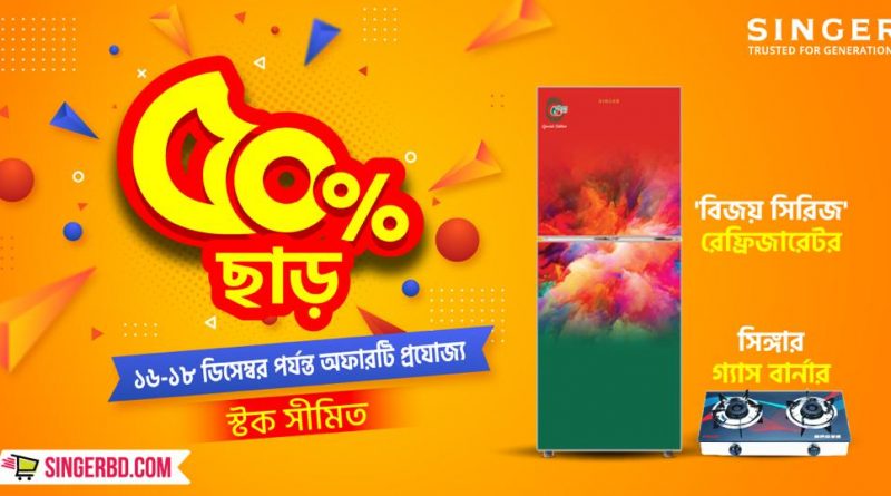 শীর্ষস্থানীয় ইলেকট্রনিক্স ও হোম অ্যাপ্লায়েন্স রিটেইলার সিঙ্গার বাংলাদেশ লিমিটেড বাংলাদেশের বিজয়ের ৫০ বছর উপলক্ষে স্পেশাল এডিশন রেফ্রিজারেটরের ওপর ৫০% ছাড়ের এক অসাধারণ অফার দিচ্ছে। ব্যতিক্রমী ডিজাইনের এই রেফ্রিজারেটরগুলো আমাদের মুক্তিযুদ্ধ ও বিজয় উদযাপনকে মাথায় রেখে ডিজাইন করা হয়েছে।