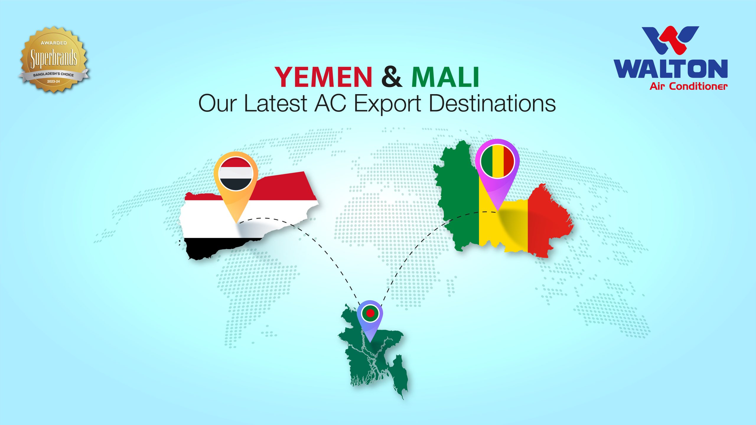 তিনি আরও বলেন, ২০১৯ সাল থেকে মধ্যপ্রাচ্যের দেশ ইয়েমেনে এসি রপ্তানি করছেন তারা। শুরুতে ওইএম’র আওতায় ইয়েমেনের শীর্ষস্থানীয় একটি ইলেকট্রনিক্স ব্র্যান্ডকে তাদের দেওয়া ডিজাইন, মান ও অন্যান্য শর্ত অনুযায়ী এসি তৈরি করে দিয়েছে ওয়ালটন। পরবর্তীতে ওই প্রতিষ্ঠানটি ইয়েমেনে ওয়ালটন ব্র্যান্ডের এসি, ফ্রিজ, টিভি, ওয়াশিং মেশিন, গ্যাস স্টোভ, ফ্যান ইত্যাদি পণ্য বিপণন ও বিক্রয় কার্যক্রম শুরু করে। ইতোমধ্যে দেশটিতে ওয়ালটন এসির বেশ কয়েকটি বড় শিপমেন্ট হয়েছে। বাংলাদেশ থেকে ইয়েমেনে পাঠানো ওয়ালটন এসির মধ্যে আছে বিশ্বের অন্যতম সর্বোচ্চ বিদ্যুৎসাশ্রয়ী ইনভার্না সিরিজের এসিসহ রিভারাইন, ডায়মন্ড, ক্রিস্টালাইন ও ওশিনাস সিরিজের অত্যাধুনিক ফিচার-সমৃদ্ধ এসি। এর পাশাপাশি সম্প্রতি পশ্চিম আফ্রিকার দেশ মালি’তে ব্র্র্যান্ড বিজনেস শুরু করেছে ওয়ালটন। দেশটিতে ওয়ালটনের নিজস্ব ব্র্যান্ড লোগেতে এসি রপ্তানি ও বিক্রি হচ্ছে।
