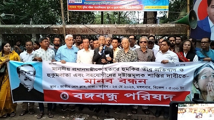 নিজস্ব প্রতিবেদকঃ আজ বিকেলে জাতীয় প্রেসক্লাবের সামনে বঙ্গবন্ধু পরিষদের উদ্যোগে প্রধানমন্ত্রীর প্রাণনাশের হুমকির প্রতিবাদে এক মানববন্ধন কর্মসূচি পালিত হয়।