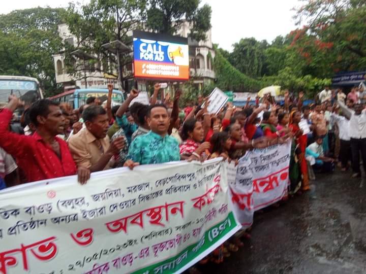 নিজস্ব প্রতিবেদকঃ অদ্য ২৭/০৫/২০২৩ইং ঝিনাইদহ ও যশোর জেলার  বলুহর কেন্দ্রীয় হ্যাচারী কমপ্লেক্স এর আওতাধীন ছয়টি প্রাকৃতিক বাওড় (বলুহর, জয়দিয়া, মরজাদ, বেড়গোবিন্দপুর, কাঠগড়া ও ফতেপুর মৎস্যজীবী অধিবাসীবৃন্দের জীবন জীবিকা নির্বাহের একমাত্র প্রতিষ্ঠান অন্যত্র ইজারা বাতিলের দাবিতে এবং প্রকৃত মৎস্যজীবীর অনুকূলে প্রাপ্তির জন্য ভূক্তভোগী মৎস্যজীবী পরিবারের অন্যতম দলনেতা সুধীর হালদার-এর সভাপতিত্বে জাতীয় প্রেসক্লাব ঢাকায় এক মানববন্ধন, বিক্ষোভ ও অবস্থান কর্মসূচি শেষে শাহবাগ অবরোধ করেন, পরবর্তীতে পুলিশের বাঁধার মুখে ও এক পর্যায়ে ধস্তাধস্তি হয় প্রায় আধাঘন্টা শাহবাগ অবরোধের পর পুলিশের উর্ধ্বতন কর্মকর্তারা ইজারা বাতিলের ক্ষেত্রে মৎস্যজীবীদের পাশে থাকার আশ্বাস প্রদান ও সার্বিক সহযোগিতার আশ্বাস প্রদান করলে, মৎস্যজীবীরা অবরোধ প্রত্যাহার করে জাতীয় জাদুঘর শাহবাগে বিকাল ৫টা পর্যন্ত  অবস্থান কর্মসূচি পালন শেষে আগামীকাল প্রেসক্লাবে মানববন্ধন ও অবস্থান কর্মসূচিসহ দুপুর ২ ঘটিকায় পদযাত্রার মাধ্যমে প্রধানমন্ত্রী কার্যালয় স্মারকলিপি প্রদানের ঘোষণা প্রদান করেন। উক্ত মানববন্ধন ও বিক্ষোভ কর্মসূচিতে বাংলাদেশ হিন্দু পরিষদ, বাংলাদেশ সনাতন পার্টি (বিএসপি), ভক্ত সংঘ সোসাইটি, বাংলাদেশ হিন্দু মহাসংঘ, সনাতনী স্বেচ্ছাসেবি ফাউন্ডেশন, এইচআরসিবিএম  আন্তর্জাতিক মানবাধিকার সংগঠনের প্রদীপ দেবনাথ, নরেন বিশ্বাস,হিমেল, নীহার হালদার,রনি রাজবংশী সহ বিভিন্ন মঠ-মন্দীর ও বিভিন্ন রাজনৈতিক দলের গণ্যমান্য ব্যক্তিবর্গ অসহায় মৎস্যজীবীদের উক্ত মানববন্ধনে একাত্মতা প্রকাশ করেন।