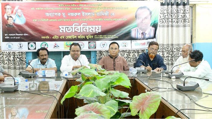 নিজস্ব প্রতিবেদকঃ আন্তর্জাতিক খ্যাতিসম্পন্ন মানবাধিকার তাত্ত্বিক, সমাজবিজ্ঞানী, নজরুল গবেষক, লঙ্ঘিত অধিকার রক্ষায় আপোষহীন নেতা,কবি অধ্যাপক মু. নজরুল ইসলাম তামিজী কে আসন্ন জাতীয় সংসদ নির্বাচনে ঢাকা ১৭ নির্বাচনী এলাকায় মনোনয়ন ও নির্বাচন বিষয়ে ২৭ মে ২০২৩ শনিবার বিকেল ৫ টায় ঢাকাস্থ বাংলাদেশ শিশুকল্যাণ পরিষদ মিলনায়তনে ২৪ টি জাতীয় পেশাজীবি সংগঠনের নেতৃবৃন্দের সাথে মতবিনিময় সভা অনুষ্ঠিত হয়।