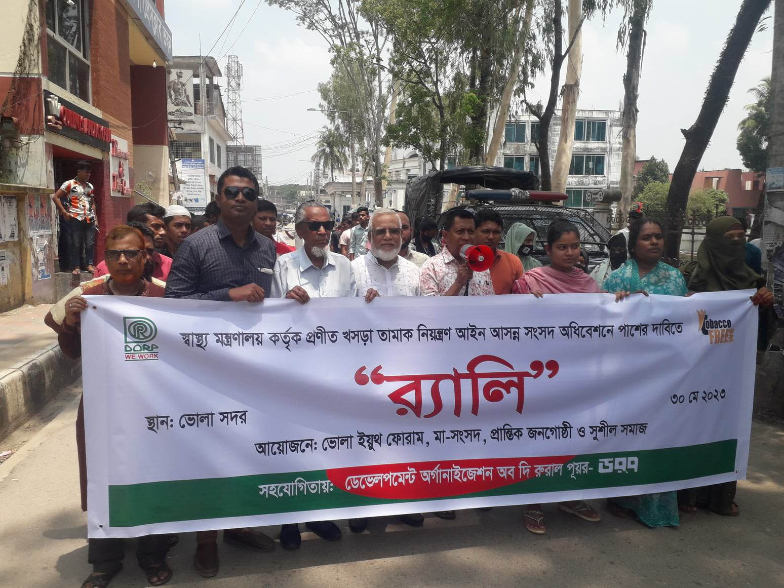 নিজস্ব প্রতিবেদকঃ জনস্বাস্থ্য রক্ষায় এবং মাননীয় প্রধানমন্ত্রী ঘোষিত ২০৪০ সালের পূর্বে বাংলাদেশকে তামাকমুক্ত করার অঙ্গীকার বাস্তবায়নের লক্ষ্যে আসন্ন সংসদ অধিবেশনে স্বাস্থ্য মন্ত্রণালয় প্রণীত খসড়া তামাক নিয়ন্ত্রণ আইন পাশ করার দাবিতে ভোলা সদর উপজেলায় মঙ্গলবার সকাল ১১টায় (৩০ মে ২০২৩) এক বর্ণাঢ্য র্যালির আয়োজন করেছে ভোলা যুব ফোরাম, মা-সংসদ, প্রান্তিক জনগোষ্ঠি, এবং সুশীল সমাজ।