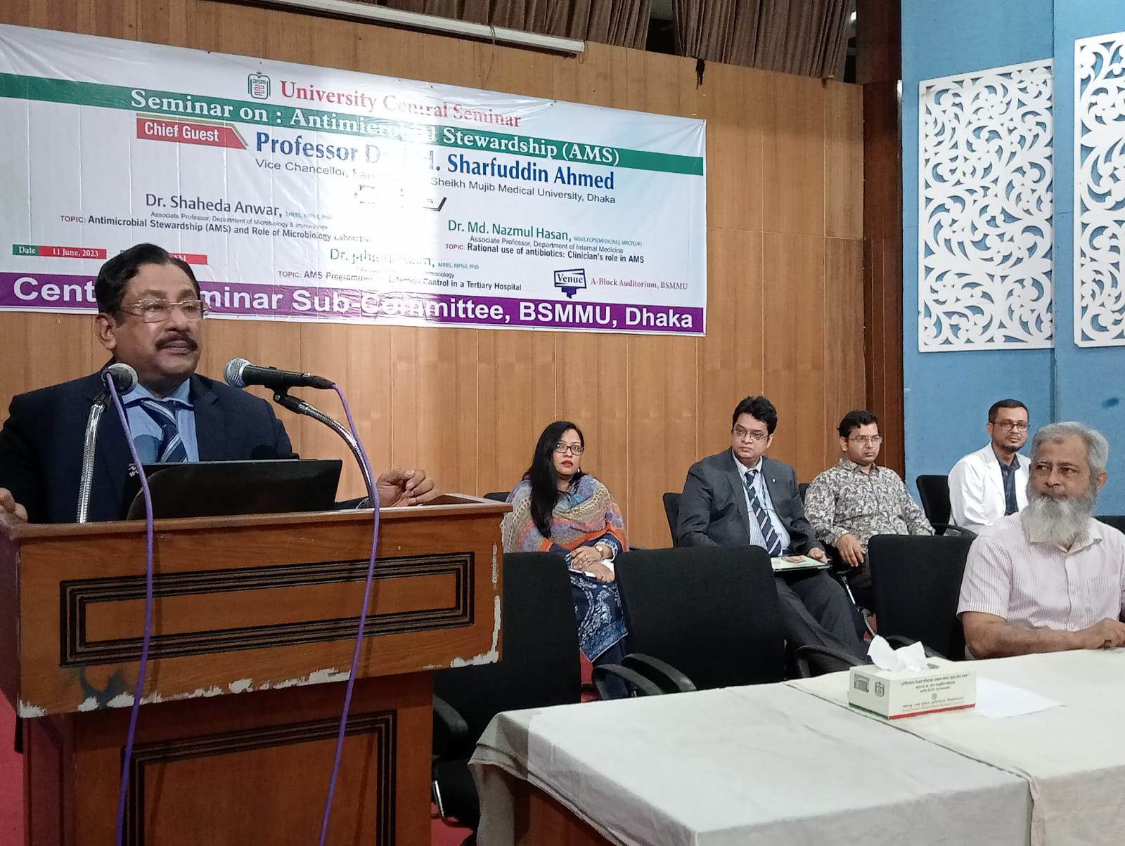 সেমিনারে মাইক্রোবায়োলজি বিভাগের সহযোগী অধ্যাপক ডা. সাঈদা আনোয়ার এন্টিমাইক্রোবায়াল স্টুওয়ার্ডশিপ কমিটির কাঠামো ও মাইক্রোবায়োলজীর ভূমিকা নিয়ে আলোকপাত করেন। তিনি বলেন, পৃথিবীর উন্নত দেশগুলোর হাসপাতালসমূহে এন্টিমাইক্রোবায়াল স্টুওয়ার্ডশিপ প্রোগ্রাম চালু হয়েছে। বিএসএমএমইউতেও এই প্রোগামটি অতিদ্রুত চালু করা প্রয়োজন। এটি সফলভাবে চালু করতে পারলে হাসপাতালে রোগী মৃত্যুর হার, রোগীর হাসপাতালে অবস্থানের সময়কাল কমানো সম্ভব হবে এবং এন্টিবায়োটিক প্রতিরোধী হয়ে উঠার প্রবণতা কমানো সম্ভব হবে। এর জন্য দরকার রোগের জীবাণু শনাক্ত এবং এন্টিবায়োটিকের কার্যক্ষমতা নির্ণয় করে সঠিক এন্টিবায়োটিক প্রয়োগ করা। এর জন্য তিনি মাইক্রোবায়োলজিস্ট, ক্লিনিক্যাল চিকিৎসবক, হাসপাতাল প্রশাসন, নার্সসহ সংশ্লিষ্টদের সমন্বিত কার্যক্রম গ্রহণের আবান জানান। এন্টিবায়োটিকের সঠিক ব্যবহার নিশ্চিত অবশ্যই করতে হবে। কারণ নিকট ভবিষতে বাজারে আর নতুন কোন এন্টিবায়োটিক আসবে না।