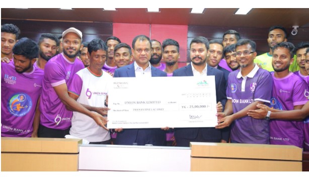 নিজস্ব প্রতিবেদকঃ শেখ হাসিনা আন্তঃব্যাংক ফুটবল টুর্নামেন্ট ২০২৩ এর চ্যাম্পিয়ন ইউনিয়ন ব্যাংক লিমিটেডের ফুটবল দলকে রুপায়ন গ্রুপ সংবর্ধনা এবং ২৫.০০ লক্ষ টাকার চেক পুরষ্কার হিসেবে প্রদান করে।