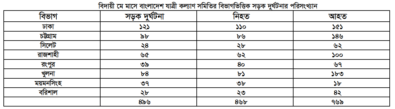 বাংলাদেশ যাত্রী কল্যাণ সমিতির পর্যবেক্ষণ মতে, মে সড়ক দুর্ঘটনার উল্লেখযোগ্য কারণসমূহ :