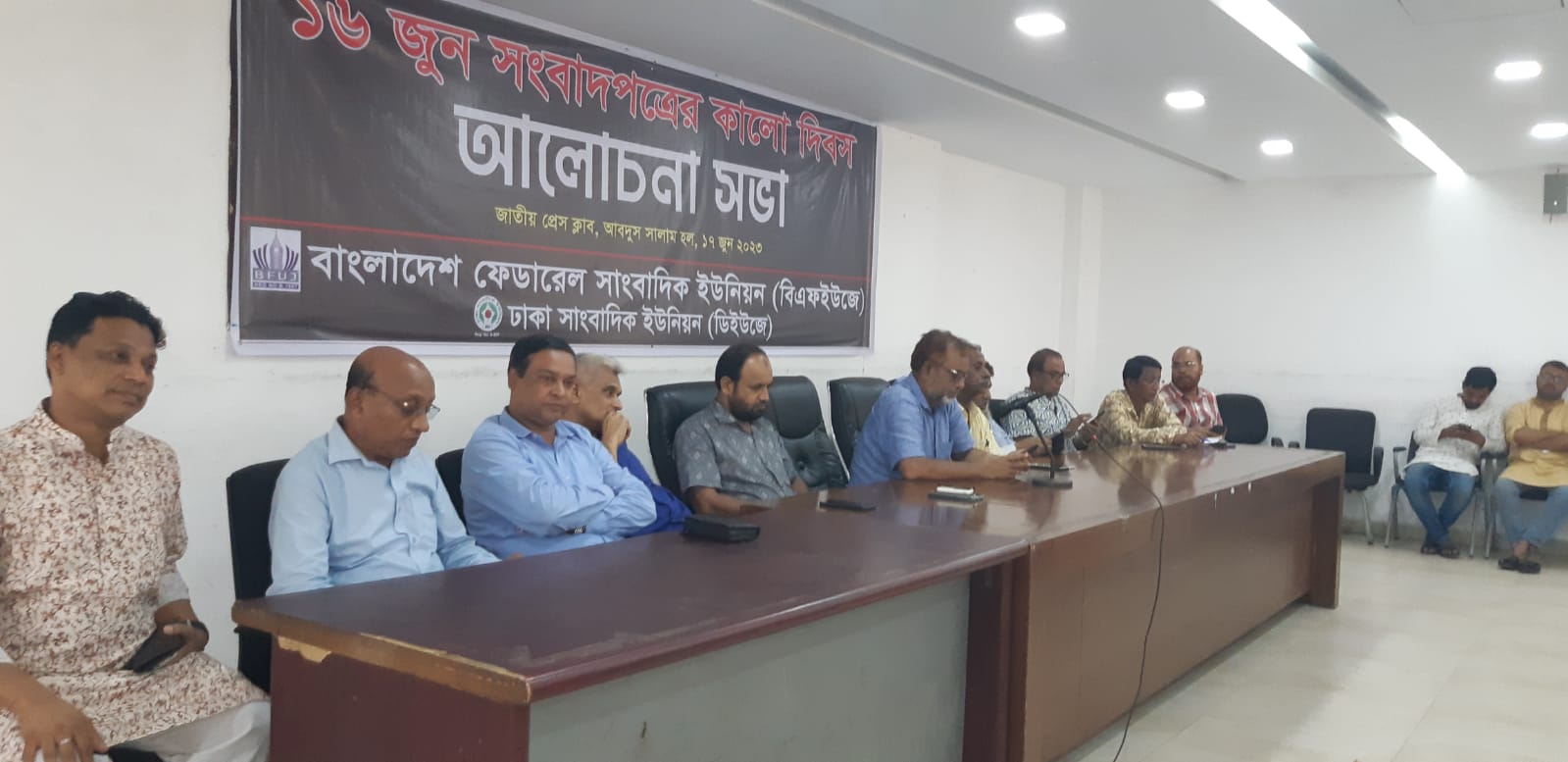 নিজস্ব প্রতিবেদকঃ ১৬ জুন সংবাদপত্রের কালো দিবস উপলক্ষে আলোচনা সভা করেছে বাংলাদেশ ফেডারেল সাংবাদিক ইউনিয়ন (বিএফইউজে) ও ঢাকা সাংবাদিক ইউনিয়ন (ডিইউজে)।