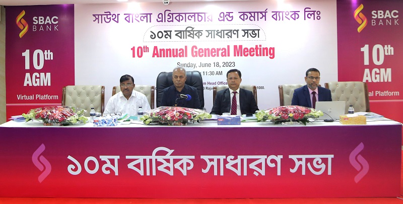 সাউথ বাংলা এগ্রিকালচার অ্যান্ড কমার্স (এসবিএসি) ব্যাংকের ১০ম বার্ষিক সাধারণ সভা (এজিএম) অনুষ্ঠিত হয়েছে। রোববার (১৮ জুন) কোম্পানির প্রধান কার্যালয় থেকে ভার্চ্যুয়াল প্লাটফর্মে এজিএমটি অনুষ্ঠিত হয়।