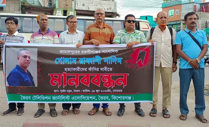 ভৈরব( কিশোরগঞ্জ) প্রতিনিধি: সাংবাদিক গোলাম রব্বানি নাদিমের হ-ত্যাকাণ্ডে জড়িতদের ফাঁ-সির দাবিতে ভৈরবে ঘন্টাব্যাপী মানববন্ধন অনুষ্ঠিত হয়েছে। আজ সোমবার বেলা ১১টায় ঢাকা-সিলেট মহাসড়কের ভৈরব দূর্জয় মোড়ে ভৈরব টেলিভিশন জার্নালিষ্ট এসোসিয়েশনের আয়োজনে এ মানবন্ধন কর্মসুচি অনুষ্টিত হয়।