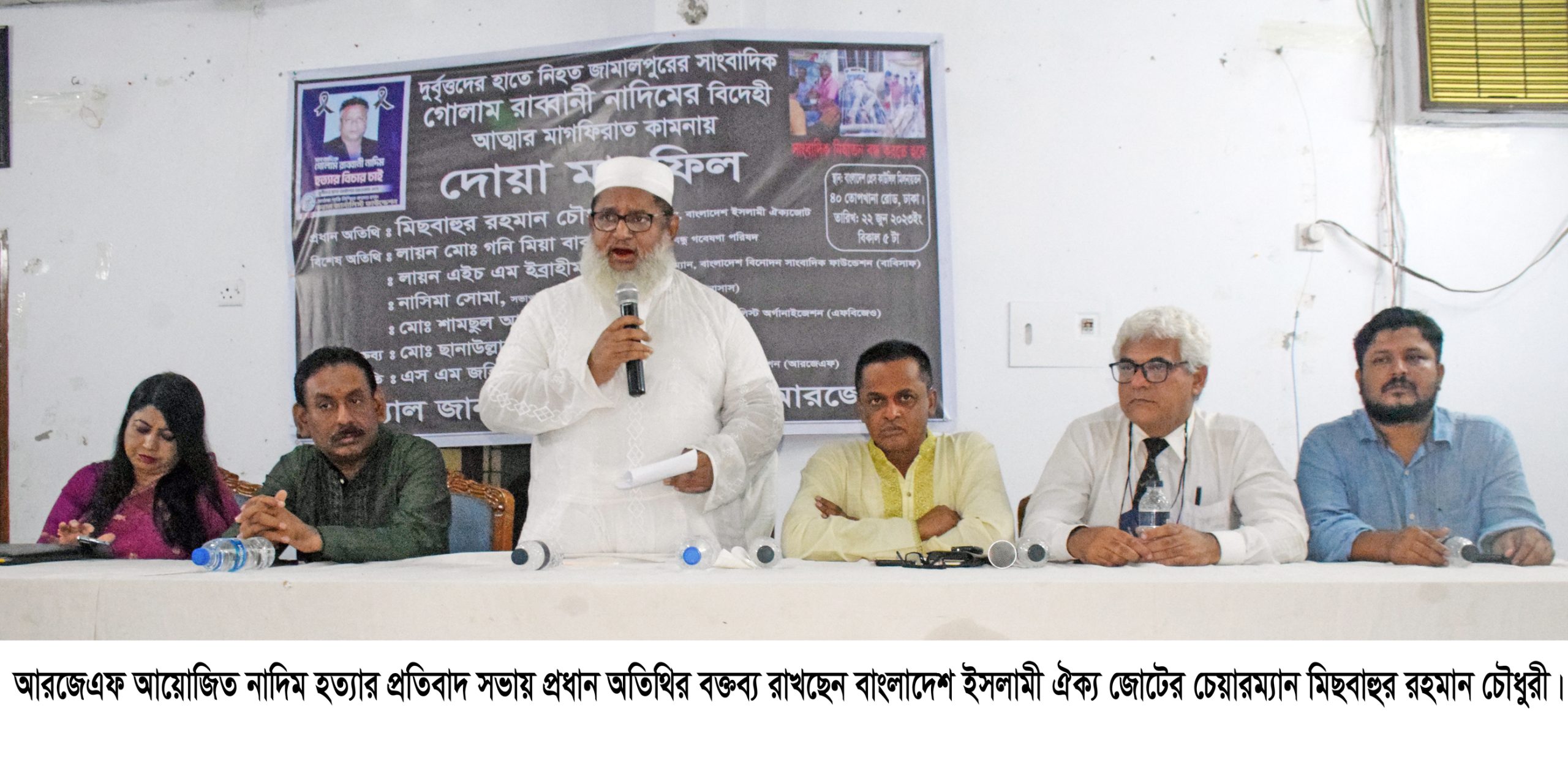 নিজস্ব প্রতিবেদকঃ সারাদেশে সাংবাদিক হত্যা, নির্যাতনের প্রতিবাদ ও জামালপুরে দুবৃত্তদের হাতে প্রয়াত সাংবাদিক গোলাম রাব্বানী নাদিম হত্যার প্রতিবাদ ও বিদেহী আত্মার মাগফেরাত কামনায় রুর‌্যাল জার্নালিস্ট ফাউন্ডেশন (আরজেএফ) এর উদ্যোগে ২২ জুন বিকেলে বাংলাদেশ প্রেস কাউন্সিল মিলনায়তনে আলোচনা সভা ও দোয়া মাহফিল অনুষ্ঠিত হয়।