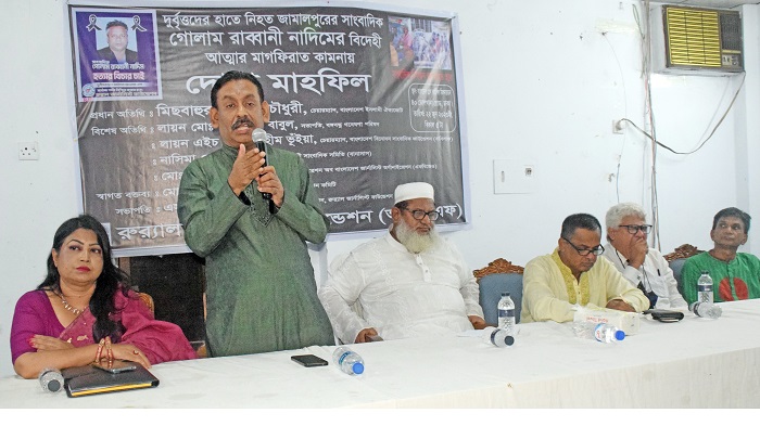 জামালপুরে দুর্বৃত্তদের হাতে প্রয়াত সাংবাদিক গোলাম রাব্বানী নাদিম হত্যার প্রতিবাদ ও বিদেহী আত্মার মাগফেরাত কামনায় রুর্যাল জার্নালিস্ট ফাউন্ডেশন (আরজেএফ) এর উদ্যোগে ২২ জুন, বৃহস্পতিবার বিকেলে বাংলাদেশ প্রেস কাউন্সিল মিলনায়তনে আয়োজিত আলোচনাসভা ও দোয়া মাহফিলে বিশেষ অতিথির বক্তব্যে তিনি এসব কথা বলেন। আরজেএফ চেয়ারম্যান এস এম জহিরুল ইসলামের সভাপতিত্বে অনুষ্ঠানে প্রধান অতিথি ছিলেন বাংলাদেশ ইসলামী ঐক্য জোটের চেয়ারম্যান মিছবাহুর রহমান চৌধুরী।