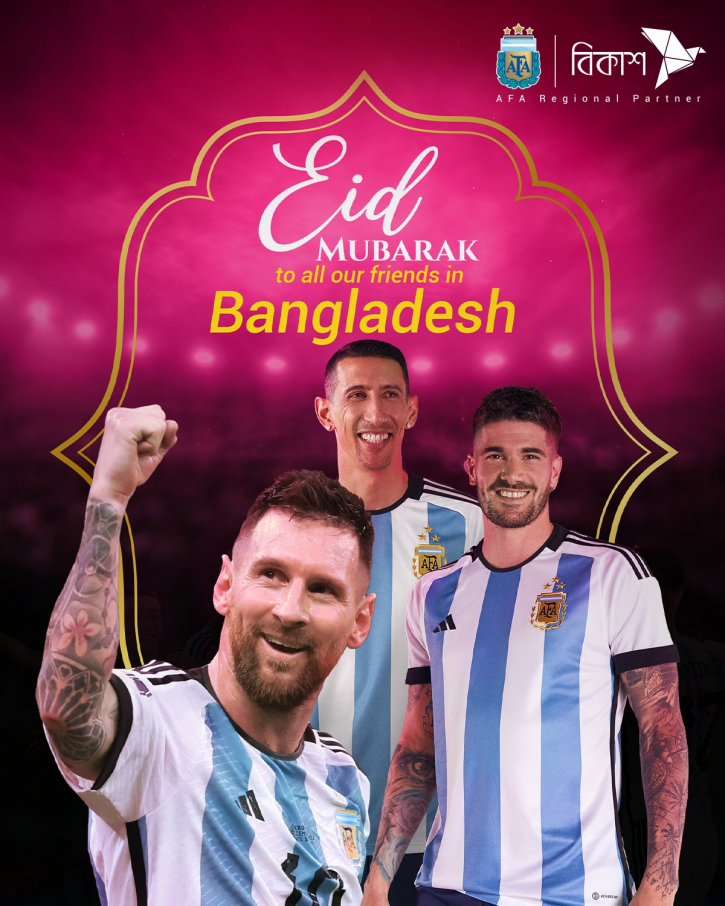 লিওনেল মেসি, ডি মারিয়া, রদ্রিগো ডি পলের ছবি সংবলিত একটি কার্ড শেয়ার করে ঈদের শুভেচ্ছা জানানো হয়েছে। এই শুভেচ্ছা বার্তায় লেখা হয়েছে, ‘বাংলাদেশের সকল প্রিয় বন্ধুদেরকে, আর্জেন্টিনা ফুটবল অ্যাসোসিয়েশনের পক্ষ থেকে ঈদ মোবারক! এই উৎসব হোক ভালোবাসা, শান্তি এবং প্রিয়জনদের সঙ্গে ভাগাভাগি করে নেওয়া স্মরণীয় মুহূর্ত।’