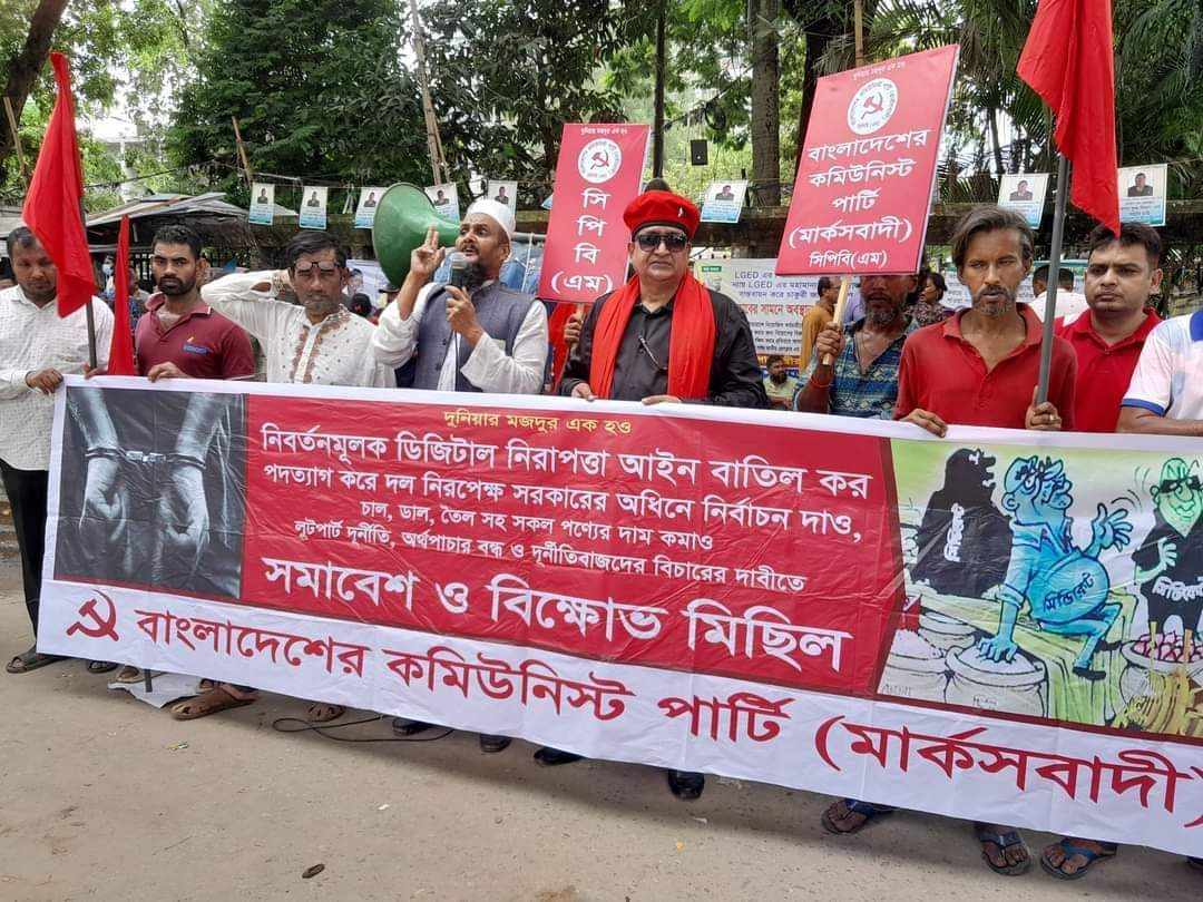 নিজস্ব প্রতিবেদকঃ আজ ৮ জুলাই ২০২৩ শনিবার দুপুরে বাংলাদেশের কমিউনিস্ট পার্টি (মার্কসবাদী)’র উদ্যোগে জাতীয় প্রেসক্লাবের সামনে কেন্দ্রীয় কমিটির সভাপতি কমরেড ডাঃ এম এ সামাদ এর সভাপতিত্বে বর্তমান আওয়ামী লীগ সরকারের পদত্যাগ, দল নিরপেক্ষ সরকারের অধীনে নির্বাচন, ডিজিটাল নিরাপত্তা আইন বাতিল এবং চাল ডাল সহ সকল পণ্যর মূল্য কমানোর দাবিতে সমাবেশ ও বিক্ষোভ মিছিল অনুষ্ঠিত হয়।