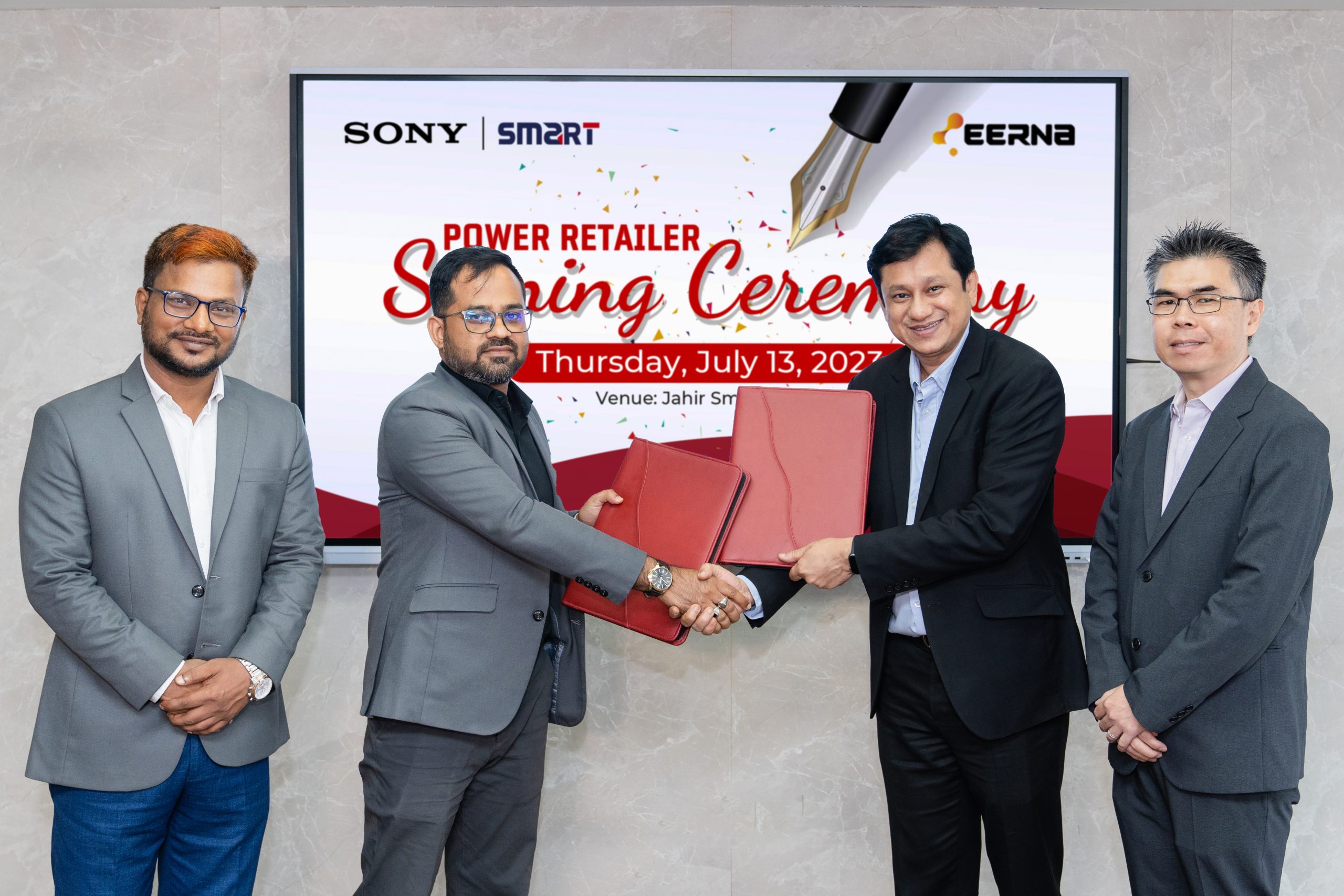 এ উপলক্ষ্যে রাজধানীর আগারগাঁওয়ের তালতলায় জহির স্মার্ট টাওয়ারে সনি-স্মার্টের নিজস্ব কার্যালয়ে আয়োজিত অনুষ্ঠানে সনি-স্মার্টের পক্ষে স্মার্ট ইলেকট্রনিকস লিমিটেডের হেড অব সেলস ও মহাব্যবস্থাপক সারোয়ার জাহান চৌধুরী এবং এরনা লিমিটেডের পক্ষে প্রতিষ্ঠানটির হেড অব রিটেইল অপারেশনস ও সহকারী মহাব্যবস্থাপক মো. ইমতিয়াজ আলম রুবেল চুক্তিতে সই করেন। এসময় স্মার্ট ইলেকট্রনিকস লিমিটেডের ডিরেক্টর মো. তানভীর হোসেন, সনি ইন্টারন্যাশনাল লি.-এর বাংলাদেশ শাখার প্রধান রিকি লুকাস, সনি-স্মার্টের বিপণন বিভাগের উপ-মহাব্যবস্থাপক আজাদ রহমান এবং এরনা লিমিটেডের সিনিয়র ম্যানেজার মোঃ নাসির উদ্দিন চৌধুরীসহ অন্যান্যরা উপস্থিত ছিলেন।