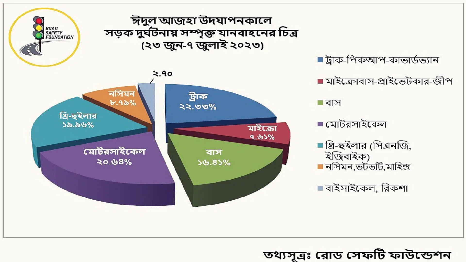 তাদের প্রতিবেদন বলছে, দুর্ঘটনার ৪৩ দশমিক ২৩ শতাংশ ঘটেছে জাতীয় মহাসড়কে। অন্যদিকে আঞ্চলিক সড়কে দুর্ঘটনার হার প্রায় ৩৮ শতাংশ। সংগঠনটির হিসাবে, দুর্ঘটনার ৪৯ শতাংশের বেশি ঘটেছে নিয়ন্ত্রণ হারিয়ে। ঈদযাত্রায় সড়ক দুর্ঘটনায় নিহত ব্যক্তিদের ৩২ দশমিক ৭১ শতাংশ মোটরসাইকেল দুর্ঘটনার শিকার। এরপরে আছে থ্রি–হুইলার যাত্রী ও পথচারী। দুর্ঘটনায় সম্পৃক্ত যানের মধ্যে মোটরসাইকেল ১২২টি, থ্রি-হুইলার ১১৮টি (ইজিবাইক-সিএনজি-অটোরিকশা-অটোভ্যান-ম্যাক্সি) এবং বাস ৯৭টি।