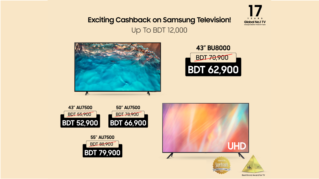 মডেলের ওপর নির্ভর করে ক্রেতারা ১২,০০০ টাকা পর্যন্ত ক্যাশব্যাক অফার উপভোগ করতে পারবেন। স্যামসাং বিইউ৮০০০ এর ৪৩ ইঞ্চি টিভির দাম এখন ৭০,৯০০ টাকার পরিবর্তে মাত্র ৬২,৯০০ টাকা। আর এইউ৭৫০০ সিরিজের টিভিগুলোর - ৪৩ ইঞ্চির দাম ৫৫,৯০০ টাকার পরিবর্তে ৫২,৯০০ টাকা, ৫০ ইঞ্চির দাম ৭৮,৯০০ টাকার পরিবর্তে ৬৬,৯০০ টাকা এবং ৫৫ ইঞ্চির দাম ৮৮,৯০০ টাকার পরিবর্তে ৭৯,৯০০ টাকা।