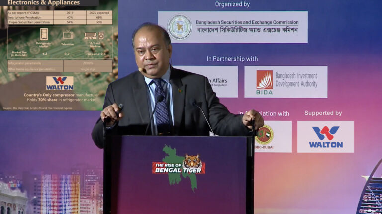 বুধবার (০৯ মার্চ) দুবাই ফেস্টিভ্যাল সিটির হোটেল ইন্টারকন্টিনেন্টালে ‘ইনভেস্টমেন্ট ফ্ল্যাশ মব: নেটওয়ার্কিং ডিনার’ শীর্ষক অনুষ্ঠানে এমন মন্তব্য করেন তিনি। প্রবাসী ও বিদেশি বিনিয়োগকারীদের বাংলাদেশের শেয়ারবাজারসহ বিভিন্ন খাতে বিনিয়োগে আগ্রহী করে তুলতে বিএসইসি অনুষ্ঠানটি আয়োজন করে। এতে সার্বিক সহযোগিতায় রয়েছে বাংলাদেশের ইলেকট্রনিকস জায়ান্ট ওয়ালটন। অনুষ্ঠানে আরব আমিরাতের বিভিন্ন প্রাতিষ্ঠানিক ও ব্যক্তি বিনিয়োগকারী এবং স্টেক হোল্ডাররা অংশ নেন।