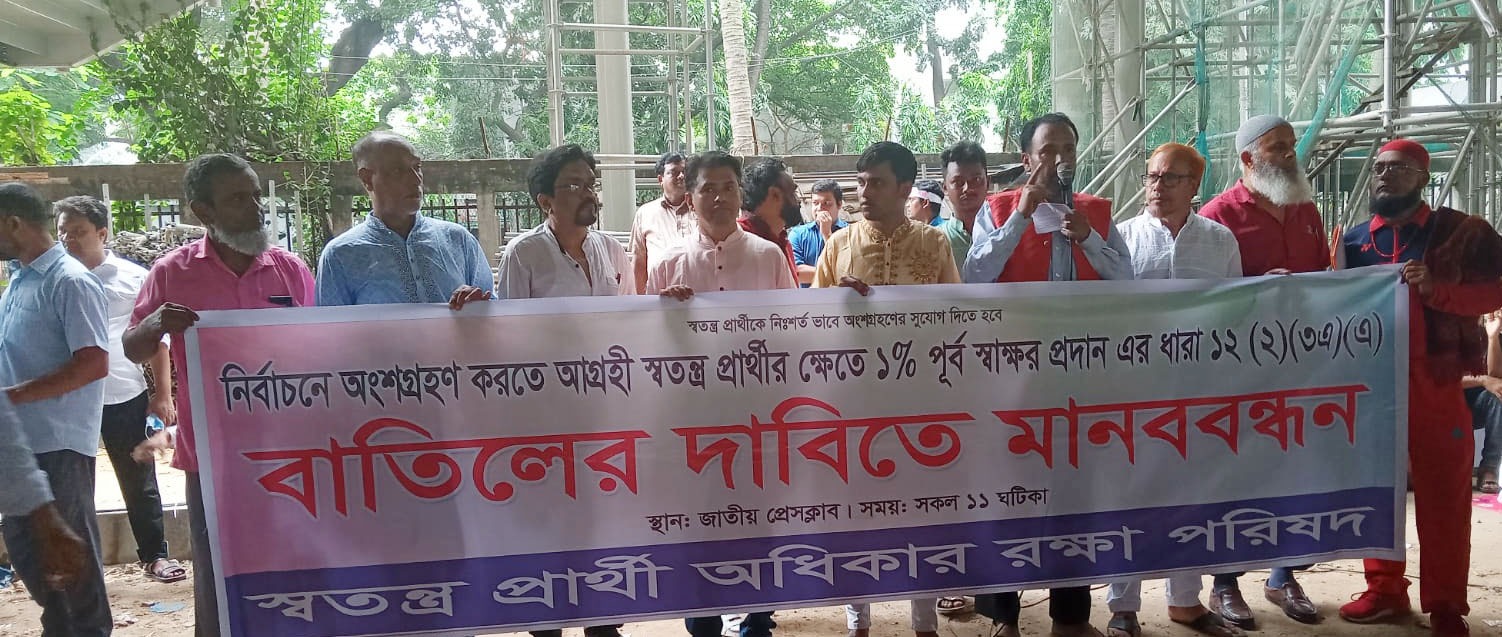 ১% ভোটারের পূর্ব স্বাক্ষর বাতিলের দাবিতে স্বতন্ত্র প্রার্থী অধিকার রক্ষা পরিষদের মানববন্ধন