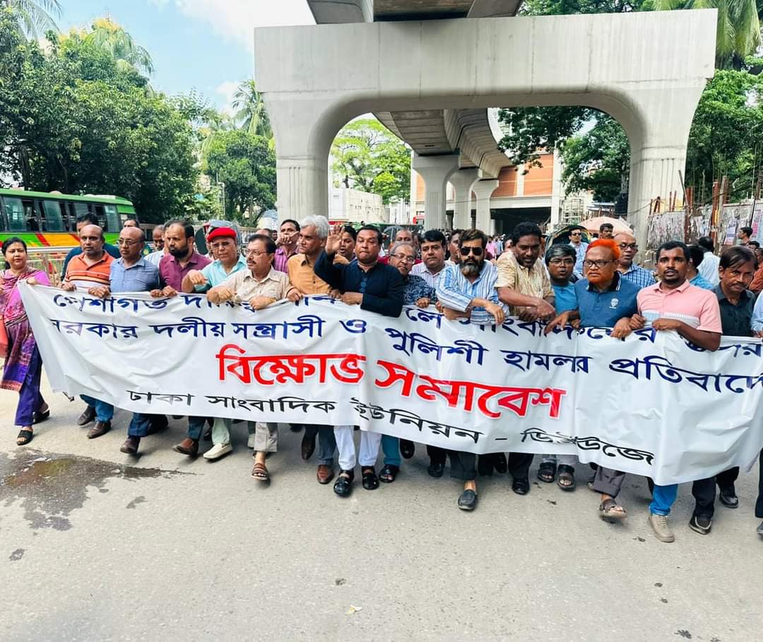 আজ রোববার জাতীয় প্রেসক্লাবের সামনে এ বিক্ষোভ সমাবেশের আয়োজন করে ডিইউজে। ডিইউজের সভাপতি শহিদুল ইসলামের সভাপতিত্বে ও সাংগঠনিক সম্পাদক সাঈদ খানের সঞ্চলনায় সমাবেশে বক্তব্য রাখেন, বিএফইউজের সাবেক সভাপতি রুহুল আমিন গাজী, সাবেক মহাসচিব এম এ আজিজ, ঢাকা সাংবাদিক ইউনিয়নের সাবেক সভাপতি কবি আবদুল হাই শিকদার, জাতীয় প্রেসক্লাবের সাবেক সভাপতি কামাল উদ্দিন সবুজ, ঢাকা সাংবাদিক ইউনিয়নের সাবেক সভাপতি কাদের গণি চৌধুরী , ডিইউজের সাধারণ সম্পাদক খুরশীদ আলম, জাতীয় প্রেসক্লাবের সাবেক সাধারণ সম্পাদক সৈয়দ আবদাল আহমেদ, ডিআরইউ সভাপতি মোরসালীন নোমানী, বিএফইউজের সিনিয়র সহ সভাপতি মোদাব্বের হোসেন, কোষাধ্যক্ষ খায়রুল বাশার, ডিইউজের সহ সভাপতি রফিক মোহাম্মদ, রাশেদুল হক, যুগ্ম সম্পাদক দিদারুল আলম, ক্রীড়া ও সংস্কৃতি সম্পাদক রফিক লিটন, দফতর সম্পাদক ইকবাল মজুমদার তৌহিদ, সাবেক কার্যনির্বাহী সদস্য এইচ এম আল আমিন প্রমুখ।