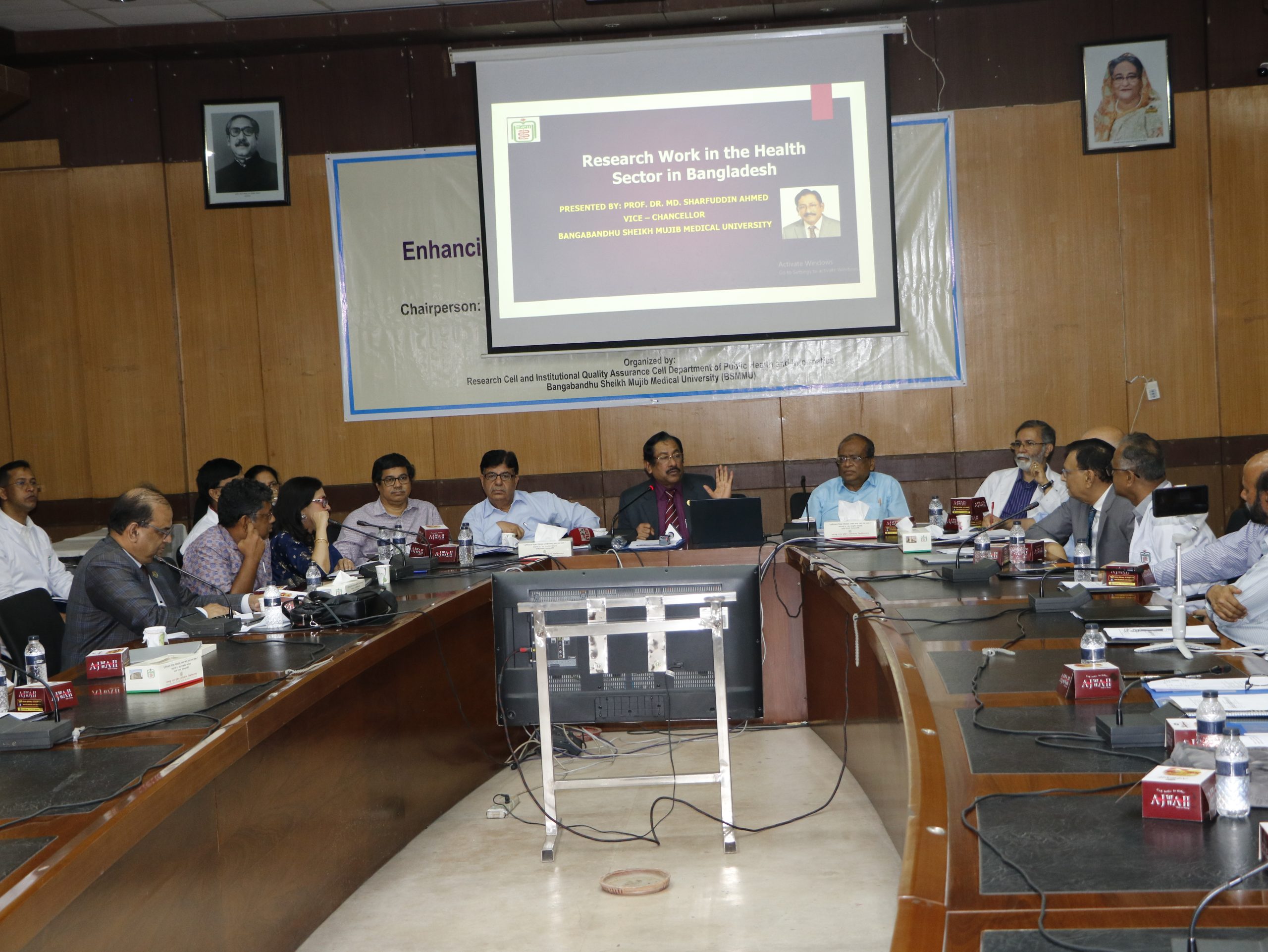 মাননীয় উপাচার্য অধ্যাপক ডা. মোঃ শারফুদ্দিন আহমেদ বলেন, বঙ্গবন্ধু শেখ মুজিব মেডিক্যাল বিশ্ববিদ্যালয় বর্তমানে গবেষণা ক্ষেত্রে অনেক দূর এগিয়েছে। ডায়াবেটিস প্রতিরোধেও গবেষণা কার্যক্রম হাতে নিয়েছে। এটা সফল করতে পারলে বছরে শত কোটি টাকা সাশ্রয় করা সম্ভব। এই বিশ্ববিদ্যালয়ে করোনা ভাইরাসের জেনোম সিকোয়েন্সিং, এর দীর্ঘ মেয়াদী প্রভাব, ভ্যাক্সিনের কার্যকারিতা নির্ণয়সহ এ বিষয়ে অনেকগুলো গবেষণা কার্যক্রম সম্পন্ন হয়েছে এবং কোনো কোনো গবেষণা কার্যক্রম চলমান রয়েছে। ফ্রেঞ্চ ফ্রাই, পাউরুটি, ডিঙ্কসসহ অনেক খাদ্যদ্রব্য নিয়ে গবেষণা হয়েছে। ভিটামিন ডি এর স্বল্পতা নিয়ে গবেষণা হয়েছে। এরকম অনেক উদাহারণ রয়েছে। তবে রোগ প্রতিরোধ যাতে করা যায় এবং রোগীদের চিকিৎসার ক্ষেত্রে উপকারে আসে তা নিশ্চিত করতে গবেষণা কার্যক্রমকে আরো বেগবান করতে হবে।