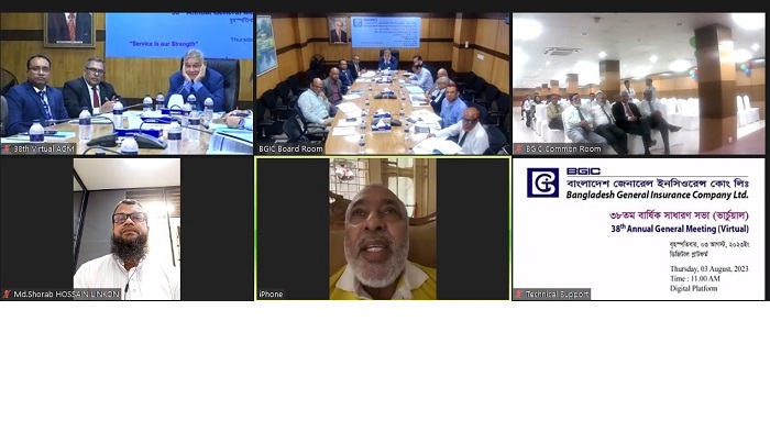 নিজস্ব প্রতিবেদকঃ বাংলাদেশ জেনারেল ইনসিওরেন্স কোম্পানী লিঃ (বিজিআইসি)-এর ৩৮ তম বার্ষিক সাধারণ সভা ০৩ আগস্ট ২০২৩ ইং তারিখে ভার্চুয়াল প্ল্যাটফর্মে অনুষ্ঠিত হয়। শুরুতে শেয়ারহোল্ডারসহ উপস্থিত সকলে কোম্পানীর প্রতিষ্ঠাতা এম এ সামাদসহ বিজিআইসি পরিবারের প্রয়াত অন্যান্য সদস্যদের বিদেহী আত্মার চির শান্তির জন্য দোয়া করেন।