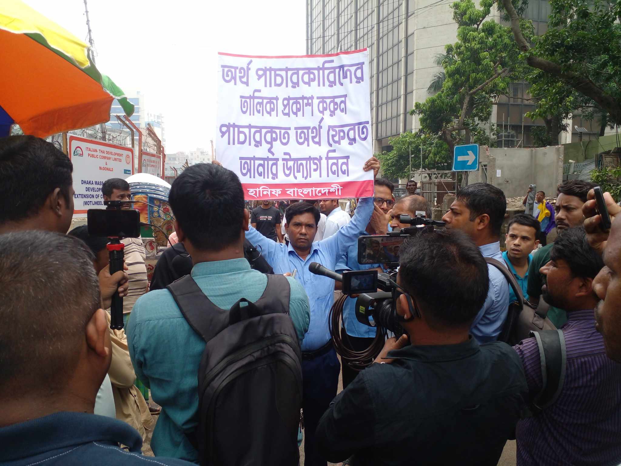 নিজস্ব প্রতিবেদকঃ অর্থ পাচারকারীদের তালিকা প্রকাশ ও পাচারকৃত অর্থ ফেরত আনতে উদ্যোগ গ্রহণের দাবিতে আজ ১৬ আগস্ট ২০২৩ বুধবার সকাল ১০টা থেকে দুপুর ১টা পর্যন্ত বাংলাদেশ ব্যাংকের সামনে অবস্থান কর্মসূচি পালন করে গভর্নর কে স্মারকলিপি দিয়েছেন হানিফ বাংলাদেশী।