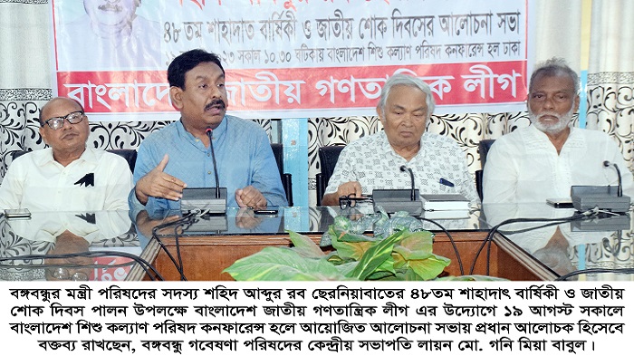 নিজস্ব প্রতিবেদকঃ বঙ্গবন্ধুর মন্ত্রী পরিষদের সদস্য শহিদ আব্দুর রব ছেরনিয়াবাতের ৪৮তম শাহাদাৎ বার্ষিকী ও জাতীয় শোক দিবস পালন উপলক্ষে বাংলাদেশ জাতীয় গণতান্ত্রিক লীগ এর উদ্যোগে ১৯ আগস্ট সকালে বাংলাদেশ শিশু কল্যাণ পরিষদ কনফারেন্স হলে আয়োজিত আলোচনা সভায় বক্তারা বলেন, ১৯৭৫ সালের ১৫ আগস্ট ভোরে বঙ্গবন্ধুর মন্ত্রী পরিষদের সদস্য শহিদ আব্দুর রব ছেরনিয়াবাত ২৭ মিন্টু রোডস্থ তার সরকারি বাসভবনে ঘাতকের হাতে শহিদ হন। মিন্টু রোডের এই বাড়িটিকে ছেরনিয়াবাত ভবন করার দাবি জানিয়েছে বক্তারা।