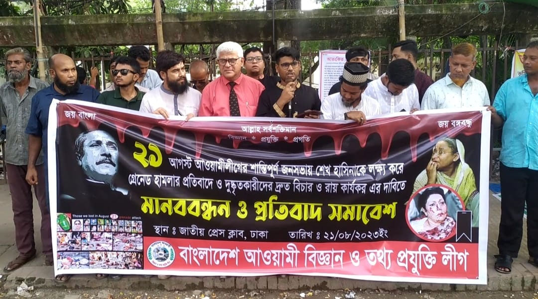 নিজস্ব প্রতিবেদকঃ ২১ আগস্ট গ্রেনেড হামলায় জড়িতদের দ্রুত বিচার ও রায় কার্যকর এর দাবিতে আজ সোমবার বিকাল ৪ ঘটিকায় জাতীয় প্রেসক্লাবের সামনে মানববন্ধন করেছে বাংলাদেশ আওয়ামী বিজ্ঞান ও তথ্য প্রযুক্তি লীগ।