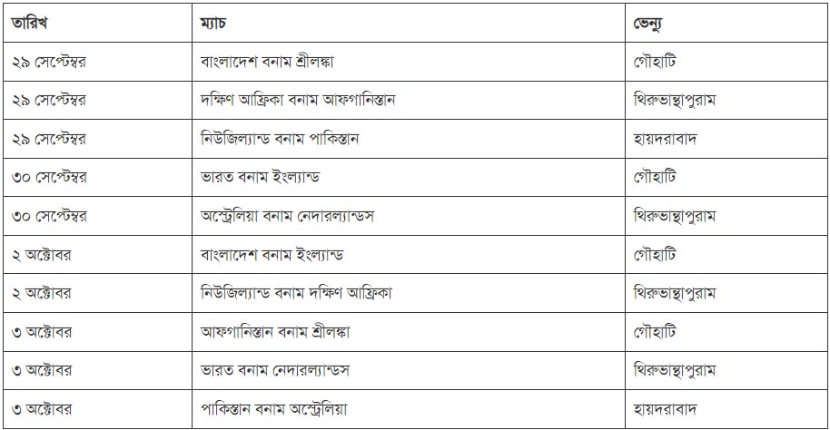 আইসিসি আগেই জানিয়েছিল, প্রতিটি দল কন্ডিশনের সঙ্গে মানিয়ে নেওয়ার সুযোগ হিসেবে দুটি করে ম্যাচ খেলার সুযোগ পাবে। এবার প্রকাশ করা হল প্রস্তুতি ম্যাচের পূর্ণাঙ্গ সূচি। বিশ্বকাপের আগে ভারতের তিন স্টেডিয়ামে ৪ দিনে মোট ১০ টি প্রস্তুতি ম্যাচের আয়োজন করবে বিশ্ব ক্রিকেটের নিয়ন্ত্রক সংস্থা।