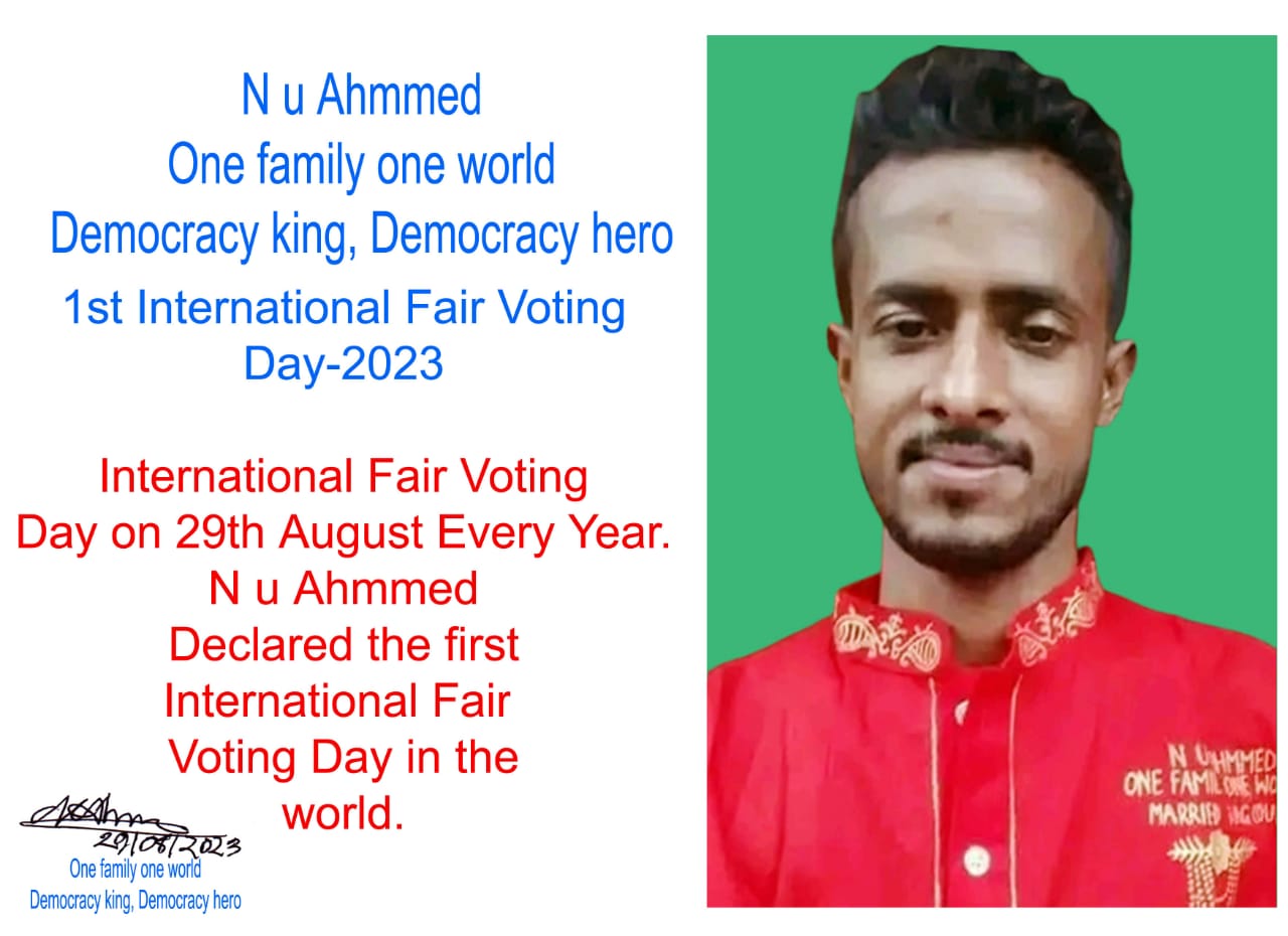 বাংলাদেশ সহ সকল দেশেই গণতান্ত্রিক নিরপেক্ষ সুষ্ঠু নির্বাচনের জন্য আদর্শ ধারণ করার উদ্দেশ্য বিশ্বে প্রথম ইন্টারন্যাশনাল ফেয়ার ভোটিং ডে পালন করার জন্য বললেন বিশ্ব গনতন্ত্র রাজা, গনতন্ত্রের হিরো এন ইউ আহম্মেদ। ভালোবাসার পতাকা রাজা, ভালোবাসার মহানায়ক এন ইউ আহম্মেদ International fair voting day সব দেশে প্রতি বছর পালন করার জন্য বলেন। প্রতি বছর ২৯ আগষ্ট সকল দেশেই, সকল জনগন এবং সকল রাজনৈতিক অরাজনৈতিক দল ইন্টারন্যাশনাল ফেয়ার ভোটিং ডে পালনের আহ্বান করেন।