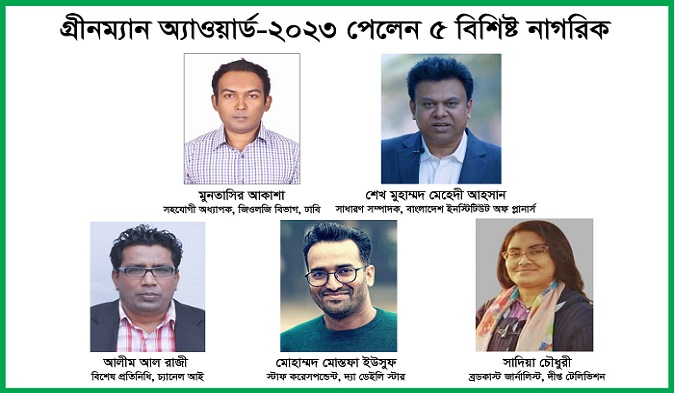 বন্যপ্রাণী ও পরিবেশ সচেতনতায় বিশেষ ভূমিকা রাখায় ঢাকা বিশ্ববিদ্যালয়ের জিওলজি বিভাগের সহযোগী অধ্যাপক মুনতাসির আকাশ, নগর পরিকল্পনা ও সবুজায়নে বিশেষ ভূমিকা রাখায় বাংলাদেশ ইনস্টিটিউট অফ প্লানার্সের সাধারণ সম্পাদক নগর পরিকল্পনাবিদ শেখ মুহাম্মদ মেহেদী আহসান, প্রাণ প্রকৃতির বৈচিত্র্যময় জীবন ও পরিবেশ সচেতনতায় বিশেষ ভূমিকা রাখায় চ্যানেল আইয়ের বিশেষ প্রতিনিধি ও প্রকৃতি নিউজ ডেস্ক ইনচার্জ আলীম আল রাজী, দেশীয় প্রজাতির গাছের বিলুপ্ত রোধে জনসচেতনতা তৈরিতে বিশেষ ভূমিকা রাখায় দ্যা ডেইলি স্টারের স্টাফ করেসপন্ডেন্ট মোহাম্মদ মোস্তফা ইউসুফ, পানি দূষণ ও পরিবেশ সচেতনতায় বিশেষ ভূমিকা রাখায় দীপ্ত টেলিভিশনের ব্রডকাস্ট জার্নালিস্ট সাদিয়া চৌধুরী গ্রীনম্যান অ্যাওয়ার্ড—২০২৩ এর জন্য মনোনীত হয়েছেন।