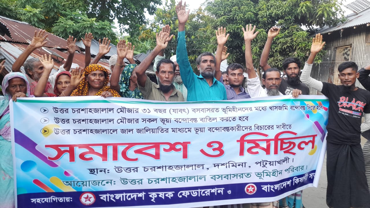 নিজস্ব প্রতিবেদকঃ আজ ১২ সেপ্টেম্ব ২০২৩ বিকাল ৪ টায় পটুয়াখালী জেলার দশমিনা উপজেলায় উত্তর চর শাহজালাল ভূমিহীন পরিবারের আয়োজনে বাংলাদেশ কৃষক ফেডারেশন ও বাংলাদেশ কিষাণী সভার সহযোগিতায় দশমিনা উপজেলায় ৭ নং চর বোরহান ইউনিয়নের ৯ নং ওয়ার্ড উত্তর চরশাহজালাল মৌজার কয়েক শত ভূমিহীন নারী-পুরুষ খাস জমি বন্দোবস্তের দাবীতে, ভুয়া বন্দোবস্ত বাতিল ও খাসজমি জাল-জালিয়াতির মাধ্যমে ভূয়া বন্দোবস্তকারীদের বিচারের দাবীতে উত্তর চর শাহজালাল বাজারে ভূমিহীন পরিবারের সমাবেশ ও মিছিল অনুষ্ঠিত হয়।