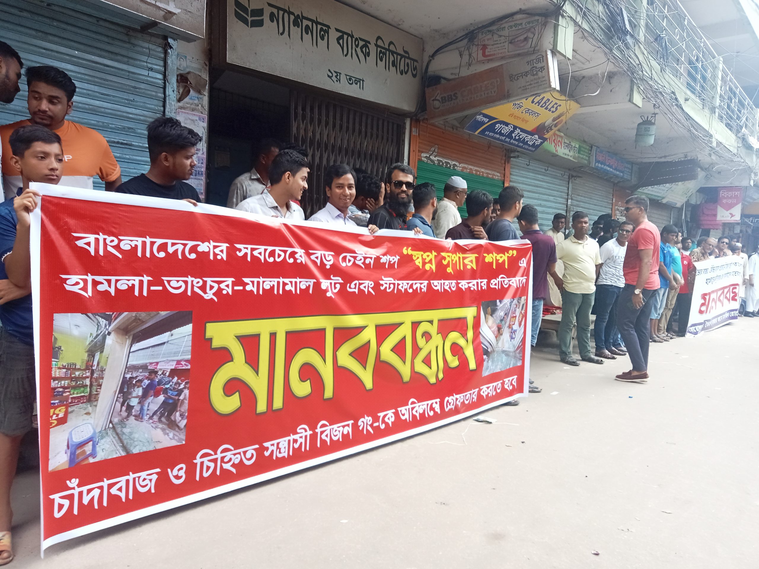 উল্লেখ্য, গত ১২ সেপ্টেম্বর বিকালে শহরের সন্ত্রাসী বিজন ও তার সমর্থকরা ভৈরব বাজারের ব্যবসা প্রতিষ্টানে ভাংচুর, চাদাঁবাজি, লুটপাট সহ ব্যসায়ীদের বেদড়ক পেটানো হয়। এ ঘটনার প্রতিবাদে আজ বৃহস্পতিবার মানববন্ধন করা হয়। ভুক্তভোগীদের অভিযোগ অনতিবিলম্ভে সন্ত্রাসী বিজনসহ হামলাকারিদের দ্রুত গ্রেফতার করে আইনের আওতায় এনে দৃষ্টান্ত মূলক শাস্তি দাবী জানান।