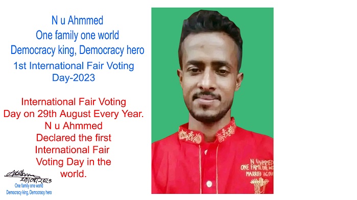 গণতন্ত্রের মহানায়ক, ভালোবাসার মহানায়ক এন ইউ আহম্মেদ তিনটা দিবস ঘোষণা করছেন, জনগনের আত্ম সম্মান গড়ে তোলতে তিনটা দিবস ঘোষণা করেন , প্রতি বছর ২৯ আগষ্ট international fair voting day। প্রতি বছর জানুয়ারি এক তারিখ থেকে ৬ তারিখ পর্যন্ত Happy international love affair meeting day।