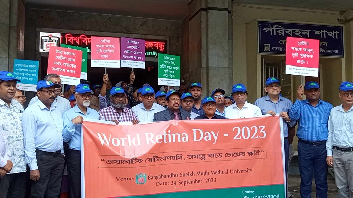 নিজস্ব প্রতিবেদকঃ বঙ্গবন্ধু শেখ মুজিব মেডিক্যাল বিশ্ববিদ্যালয়ের (বিএসএমএমইউ) চক্ষু বিজ্ঞান বিভাগ ও বাংলাদেশ ভিট্রিওরেটিনা সোসাইটির যৌথ উদ্যোগে “ডায়াবেটিক রেটিনোপ্যাথি, অযতেœ বাড়ে চোখের ক্ষতি” প্রতিপাদ্য নিয়ে বিশ্ব রেটিনা দিবস ২০২৩ পালিত হয়েছে।