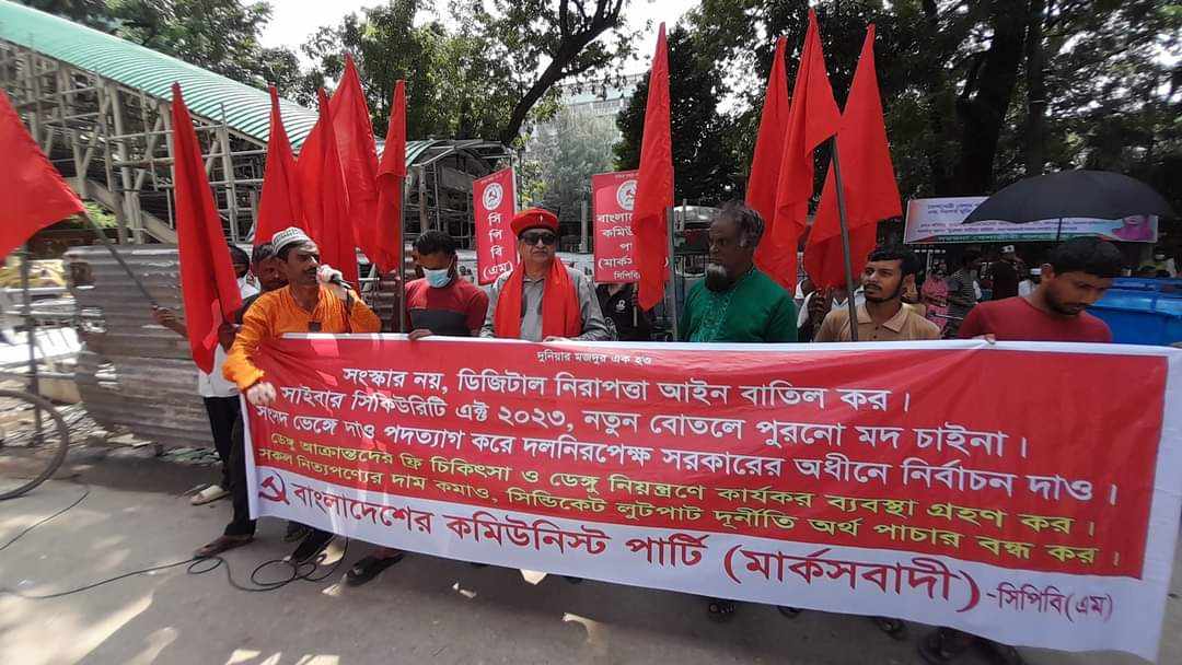 নিজস্ব প্রতিবেদকঃ আজ সোমবার ২৫ সেপ্টেম্বর ২০২৩ সকল ধরনের নিত্যপণ্যের দাম কমানো সংসদ ভেঙ্গে দিয়ে সরকারের পদত্যাগ ও দল নিরপেক্ষ সরকারের অধিনে নির্বাচনের দাবিতে বাংলাদেশের কমিউনিস্ট পার্টি (মার্ক্সবাদী)—সিপিবি(এম) এর উদ্যোগে জাতীয় প্রেসক্লাবের সামনে সমাবেশ ও বিক্ষোভ মিছিল অনুষ্ঠিত হয় এতে সভাপতিত্ব করেন পার্টির কেন্দ্রীয় কমিটির সভাপতি কমরেড ডাঃ এম এ সামাদ।
