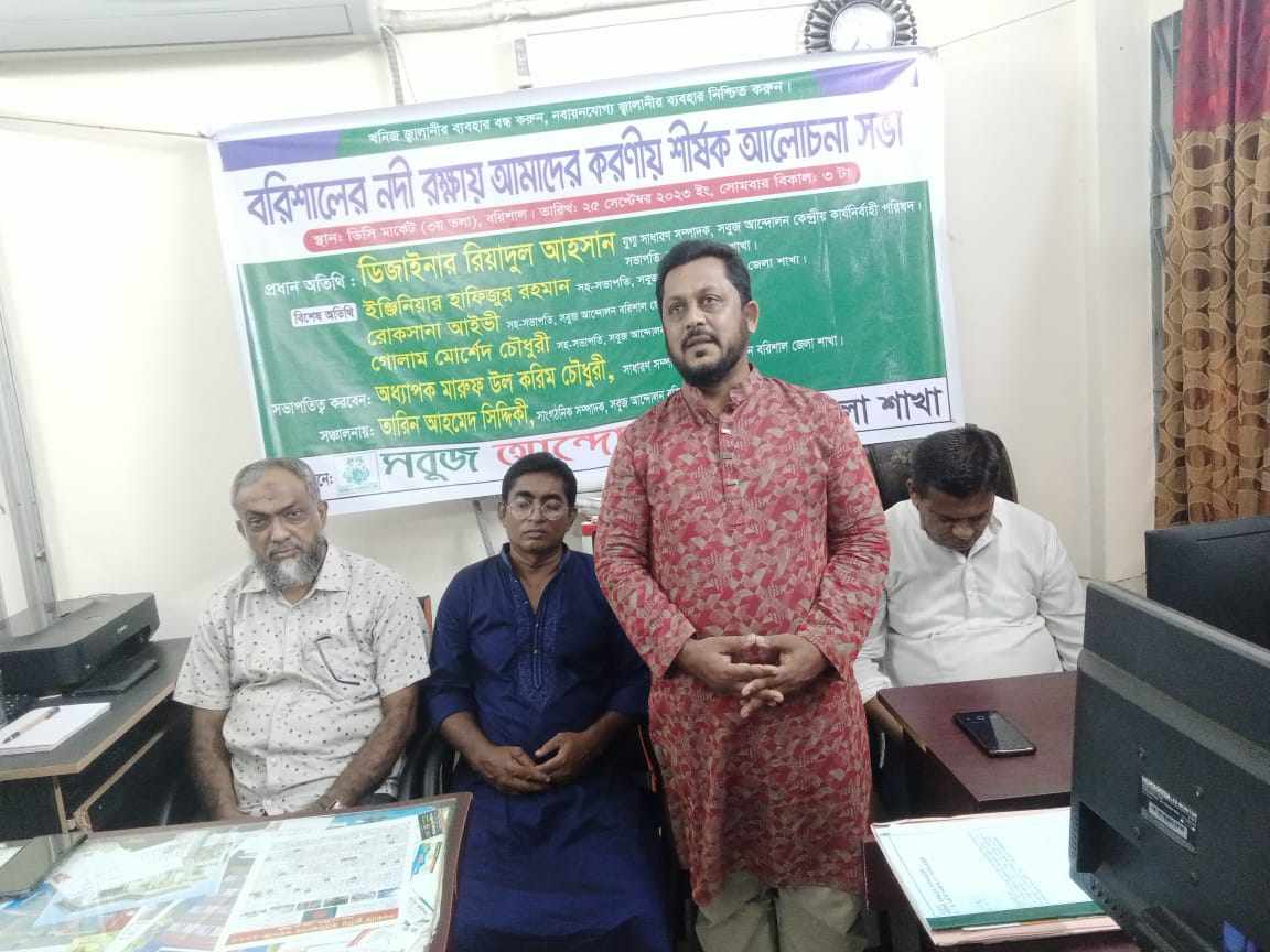 আজ ২৫ সেপ্টেম্বর সবুজ আন্দোলন বরিশাল জেলা শাখার উদ্যোগে শহরের ডিসি মার্কেটে” বরিশালের নদীর রক্ষা করনীয় শীর্ষক” আলোচনা সভার আয়োজন করে। সবুজ আন্দোলন বরিশাল জেলা শাখার সাধারণ সম্পাদক অধ্যাপক মারুফ উল করিম চৌধুরী সভাপতিত্বে আলোচনা সভায় প্রধান অতিথি হিসেবে বক্তব্য রাখেন কেন্দ্রীয় কার্যনির্বাহী পরিষদের যুগ্ম সাধারণ সম্পাদক ও জেলার সভাপতি ডিজাইনার রিয়াদুল আহসান। জেলার সাংগঠনিক সম্পাদক তারিন আহমেদ সিদ্দিকী সঞ্চালনায় বিশেষ অতিথি হিসেবে বক্তব্য রাখেন জেলার সহ-সভাপতি ইঞ্জিনিয়ার মোঃ হাফিজুর রহমান, রোকসানা আইভী, গোলাম মোর্শেদ চৌধুরী।