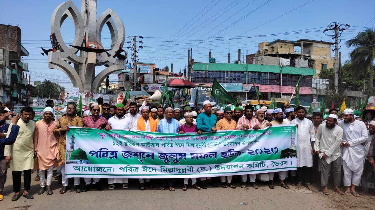আজ সকালে ভৈরব উপজেলা আহলে সুন্নাত ওয়াল জামাআত এর উদ্যোগে বিভিন্ন ইউনিয়ন ও পৌরসভা থেকে বাসস্ট্যান্ড ফল মার্কেটের সামনে জড়ো হয়ে বিশাল মিছিল মহাসড়ক প্রদক্ষিণ করে ভৈরব সরকারি কেবি মডেল হাই স্কুলে গিয়ে শেষ হয়। সকাল দশটা থেকেই জশনে জুলুস মিছিলে বিভিন্ন রকম ব্যানার-ফেস্টুন নিয়ে নবীপ্রেমী হাজারো মানুষ অংশ নেয়। সারা বিশে^র মোসলমানদের শান্তি কামনায় মোনাজাত করা হয়।