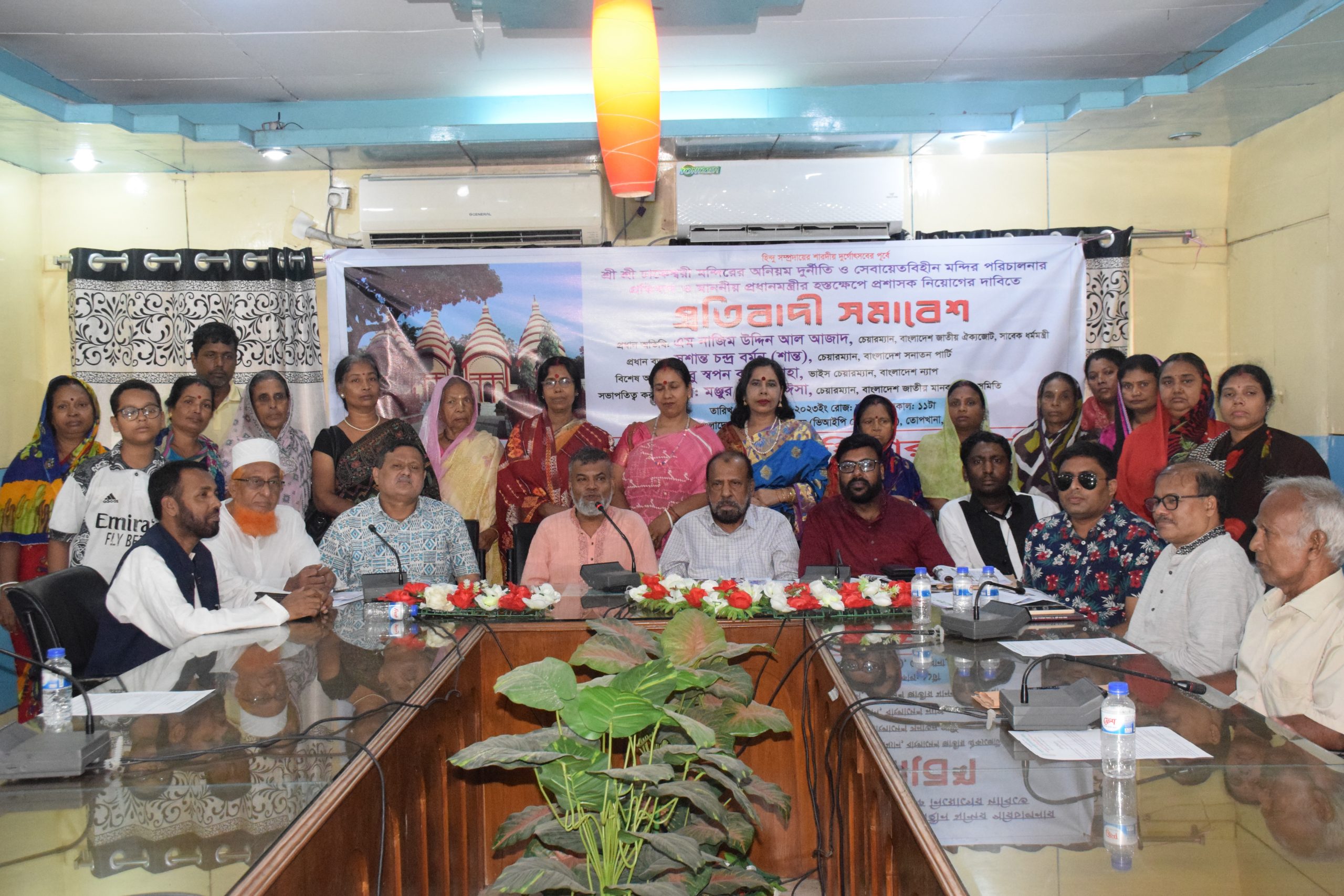 সভাপতি মঞ্জুর হোসেন ঈসা তার বক্তব্যে বলেন, শ্রী শ্রী ঢাকেশ্বরী জাতীয় মন্দির সৃষ্টিলগ্ন থেকে বিশেষ করে ১৯৭১ সনে মুক্তিযুদ্ধের সময় যে সেবায়েত এই মন্দির আগলে রেখেছিল আজকে তারা অধিকার বঞ্চিত। ঢাকেশ্বরী মন্দিরের সি এস রেকর্ড হইতে বর্তমান রেকর্ড পর্যন্ত জমি সংক্রান্ত একমাত্র সেবায়েত সত্বেও এই সেবায়েত কেন মন্দিরে অধিকার বঞ্চিত। ১৯৯০সনে ঢাকেশ্বরী মন্দির সাম্প্রদায়িক হামলায় ক্ষতিগ্রস্ত হলে তৎকালীন জননেত্রী বর্তমান প্রধানমন্ত্রী শেখ হাসিনা ঢাকেশ্বরী মন্দির পরিদর্শন কালীন সেবায়েত প্রধান মমতা রানী দাস কে জড়িয়ে ধরে আশ্বাস দিয়েছিলেন ক্ষমতায আসলে মন্দির ও সেবাযেতের উন্নয়ন ও সুব্যবস্থা করা হবে কিন্তু দুর্নীতিবাজ সুবিধা বাদীদের দৌরাত্তে আজও মাননীয় প্রধানমন্ত্রীর আশ্বাস বাস্তবায়িত হয়নি। বাংলাদেশের সকল মন্দির পরিচালনা ব্যবস্থা সেবায়েত প্রথা প্রচলন থাকলেও ঢাকেশ্বরী মন্দিরের সেবাযেত কেন বিতাড়িত। মহামান্য উচ্চ আদালতের দুর্নীতি সংক্রান্ত রুল আদেশ চলমান থাকা অবস্থায় সরকারী প্রায় অর্ধশত কোটি টাকা খরচে মন্দির উন্নয়নের নামে মন্দির অভ্যন্তরে বাণিজ্যিক ভবন নির্মাণ করে মন্দিরকে বাণিজ্য কেন্দ্র বানানোর প্রক্রিয়া চলমান থাকলেও সেবায়েতের মতামত ও সিদ্ধান্ত নেয়া হচ্ছে না। ঢাকেশ্বরী জাতীয় মন্দিরে ধর্মীয় ব্যানারের অন্তরালে ঘটমান অনিয়ম বন্ধে চলমান সকল কার্যক্রমে সরকারি হস্তক্ষেপ এবং অধিকার বঞ্চিত সেবায়েতের অধিকার ফিরিয়ে দিতে আপনি/আপনাদের ভূমিকা ও সহযোগিতা কামনা করছি।