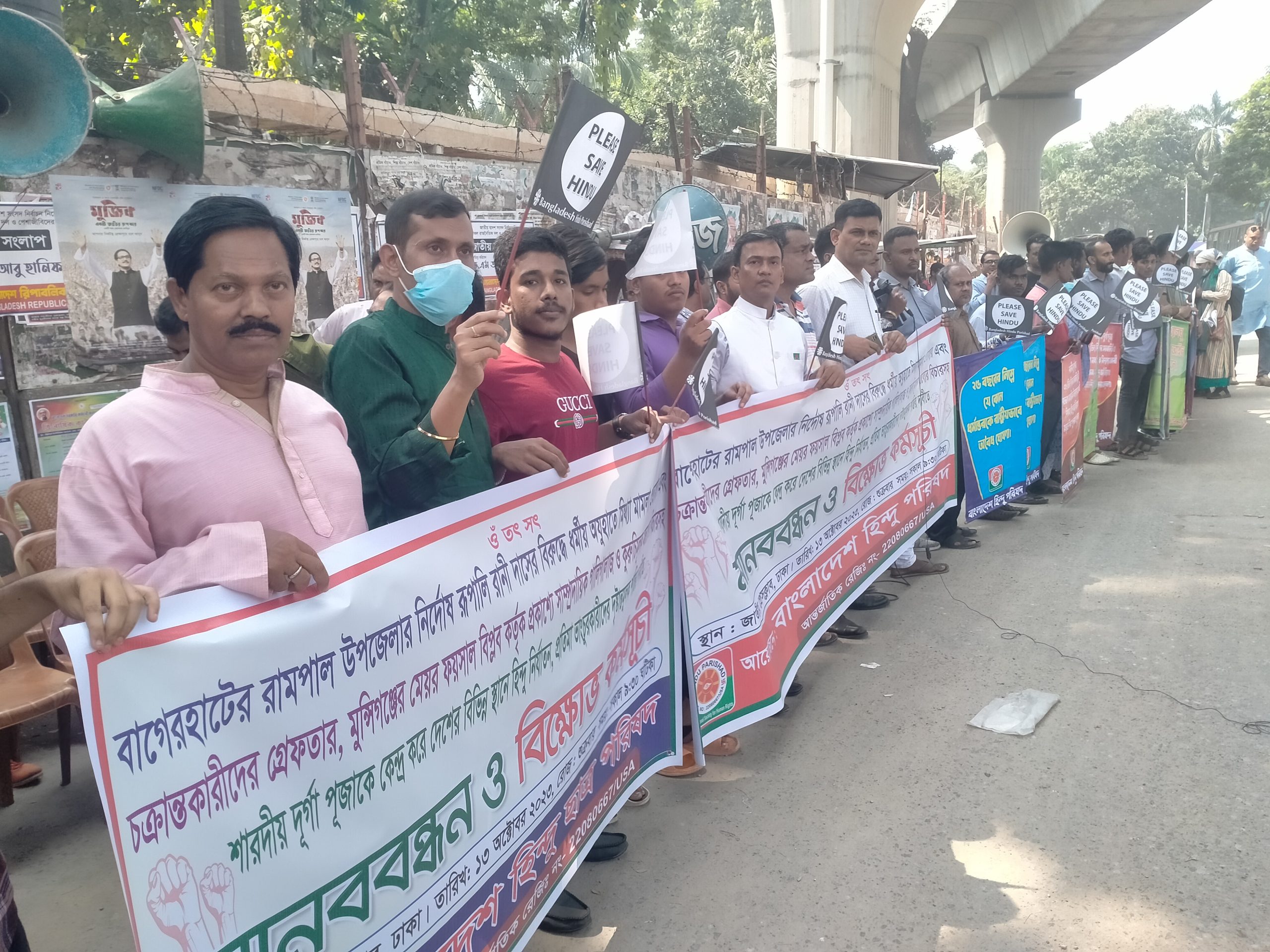 নিজস্ব প্রতিবেদকঃ অদ্য ১৩ অক্টোবর ২০২৩ খ্রি: তারিখ শুক্রবার বাগেরহাটের রামপাল উপজেলার নির্দোষ রূপালি দাসের বিরুদ্ধে ধর্মীয় অযুহাতে মিথ্যা মামলা প্রত্যাহার এবং চক্রান্তকারীদের গ্রেফতার, মুন্সিগঞ্জের মেয়র ফয়সাল বিপ্লব কর্তৃক প্রকাশ্যে হিন্দুদেরকে সাম্প্রদায়িক গালিগালাজ ও কুরুচিমূলক মন্তব্যের বিচারসহ শারদীয় দুর্গাপূজাকে কেন্দ্র করে দেশের বিভিন্ন স্থানে হিন্দু নির্যাতন, প্রতিমা ভাংচুরকারীদের দৃষ্টান্তমুলক শাস্তির দাবীতে জাতীয় প্রেসক্লাব চত্বর, ঢাকায় বাংলাদেশ হিন্দু পরিষদ কেন্দ্রীয় কমিটি কর্তৃক মানববন্ধন ও বিক্ষোভ কর্মসূচী আয়োজন করা হয়।