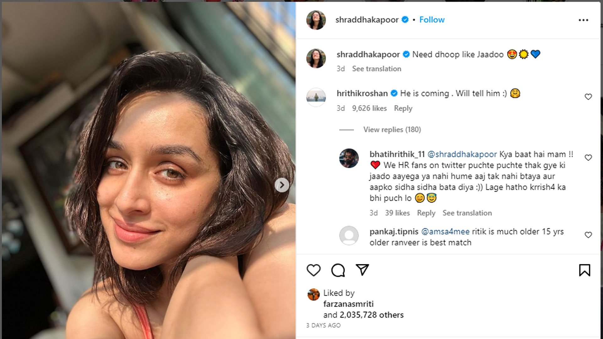 শ্রদ্ধার পোস্টটি অনুরাগীদের পাশাপাশি হৃতিক রোশনেরও মনোযোগ আকর্ষণ করে। নায়িকার ছবির নিচে মন্তব্যের ঘরে প্রতিক্রিয়া জানিয়ে হৃতিক লেখেন, ‘সে আসছে। তাকে জানিয়ে দিব।’
