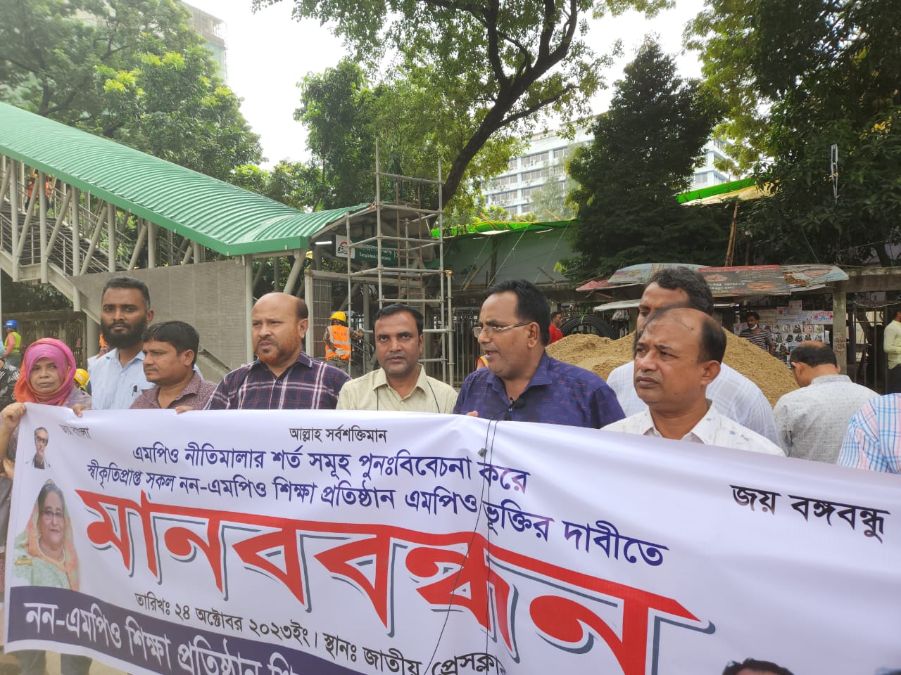 মানববন্ধনে সভাপতির বক্তব্যে নন-এমপিও শিক্ষা প্রতিষ্ঠান শিক্ষক-কর্মচারী পরিষদের আহ্বায়ক অধ্যক্ষ মোঃ দবিরুল ইসলাম বলেন, মাননীয় শিক্ষামন্ত্রী মহোদয় ২০২১ সালে বলেছিলেন, “শিক্ষাপ্রতিষ্ঠান এমপিওভুক্তি একটি চলমান প্রক্রিয়া। প্রতিবছর এমপিওভুক্তির জন্য আবেদন নেয়া হবে।” কিন্তু দুঃখের বিষয় ২০২২ সালে কোন আবেদন নেয়া হয়নি। ২০২৩ চলে যাচ্ছে, যদিও আবেদন নেয়ার কথা ছিল কিন্তু এখন পর্যন্ত তা নেয়া হচ্ছে না। ২০২৩ সালে যদি আবেদন না নেয়া হয় তাহলে অনেক শিক্ষা প্রতিষ্ঠান বন্ধ হয়ে যাবে। কারণ দীর্ঘ ২০-২৫ বছর ধরে বিনা বেতনে কেউ চাকরি করতে পারে না। গত ১৪ আগস্ট ২০২৩ইং তারিখে মাননীয় শিক্ষামন্ত্রী নিজ নির্বাচনী এলাকা চাঁদপুরে নন-এমপিও শিক্ষকদের অমানবিক কষ্টের কথা চিন্তা করে বিশেষ বিবেচনায় ২টি শিক্ষাপ্রতিষ্ঠান এমপিওভুক্ত করেছেন। আমরা মনে করি, বাংলাদেশের সকল নন-এমপিও শিক্ষা প্রতিষ্ঠানের অভিভাবক মাননীয় শিক্ষামন্ত্রী। তাই নন-এমপিও শিক্ষা প্রতিষ্ঠানের শিক্ষক-কর্মচারীদের সীমাহীন কষ্টের কথা চিন্তা করে দ্বাদশ জাতীয় সংসদ নির্বাচনকে সামনে রেখে এমপিও নীতিমালা ২০২১ এর সকল শর্ত শিথিল করে বিশেষ বিবেচনায় স্বীকৃতিপ্রাপ্ত চলমান সকল নন-এমপিও শিক্ষা প্রতিষ্ঠান একযোগে এমপিওভুক্ত করে আপনার সরকারের প্রতিশ্রুতি বাস্তবায়নের দাবি জানাচ্ছি।