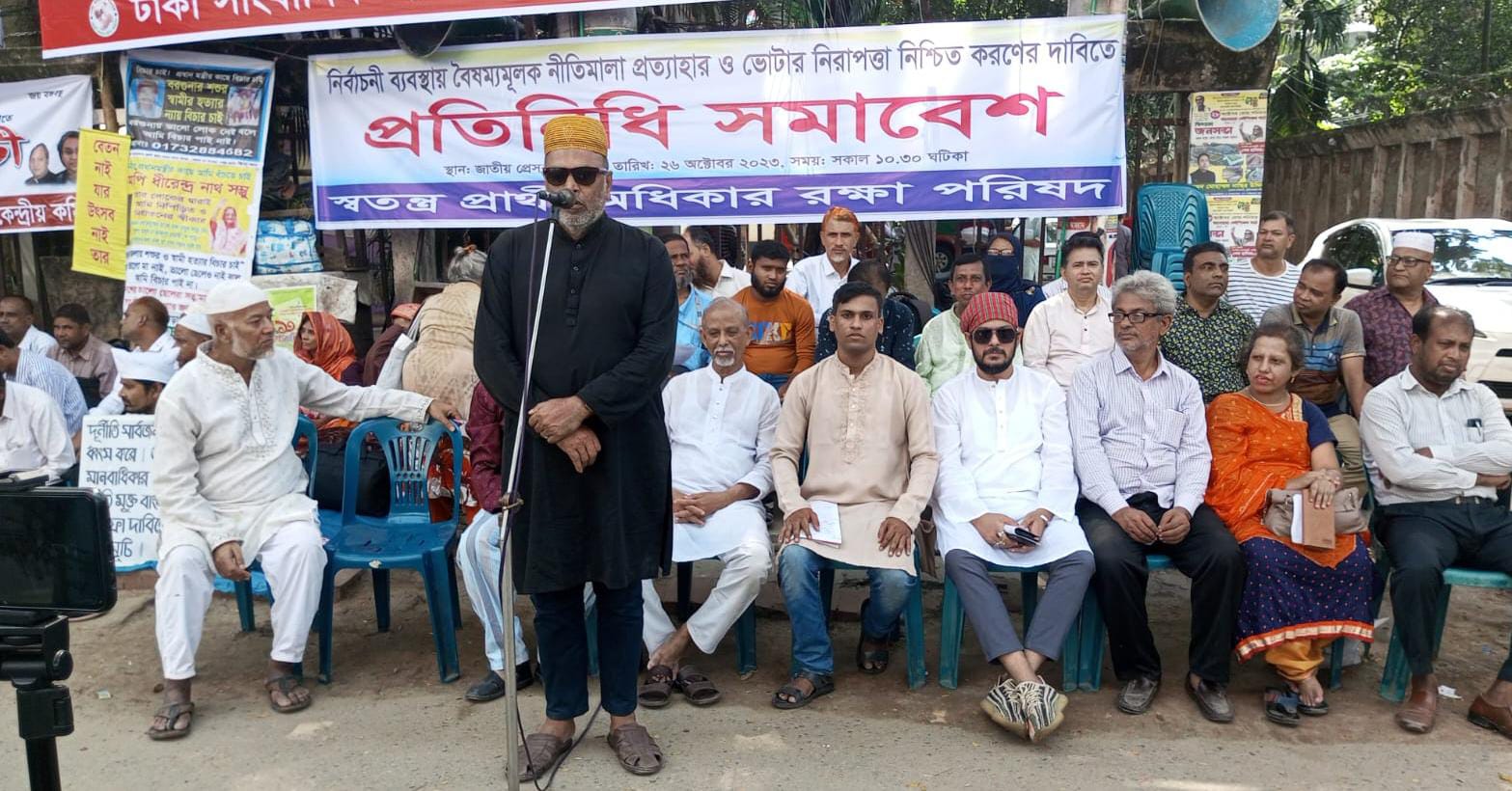 নিজস্ব প্রতিবেদকঃ ভোটার নিরাপত্তা নিশ্চিতকরণ ও নির্বাচনী ব্যবস্থায় বৈষম্যমূলক নিয়মাবলী সংশোধনের দাবিতে বৃহস্পতিবার সকাল ১০.৩০ মিনিটে জাতীয় প্রেসক্লাব সম্মুখে স্বতন্ত্র প্রার্থী অধিকার রক্ষা পরিষদের উদ্যোগে এক বিশাল প্রতিনিধি সমাবেশ অনুষ্ঠিত হয়। সমাবেশে আগামী দ্বাদশ সংসদ নির্বাচনে অংশগ্রহণ করতে আগ্রহী প্রার্থীগণ এবং বিভিন্ন রাজনৈতিক দলের চেয়ারম্যান/মহাসচিবসহ বিভিন্ন স্তরের নেতৃবৃন্দ উপস্থিত ছিলেন।