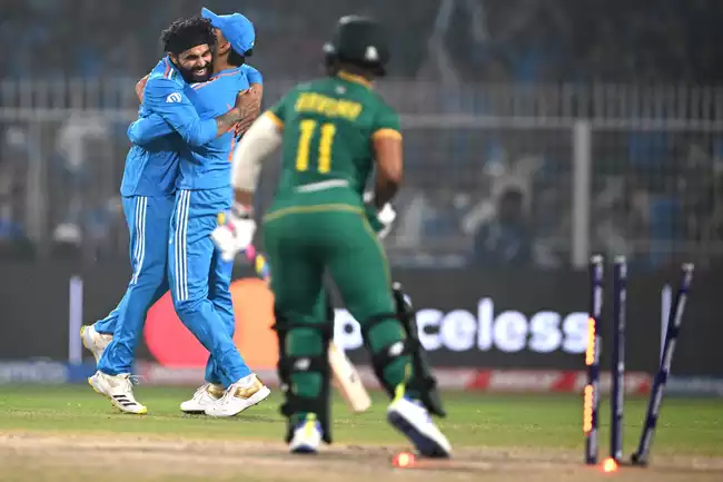 জবাবে ব্যাট করতে নেমে শুরুতেই ধাক্কা খায় ভারত। চলতি বিশ্বকাপে চারটি সেঞ্চুরি করা কুইন্টন ডি কক মাত্র ৫ রান করে সিরাজের বলে ইনসাউড এজড হয়ে বোল্ড হয়ে যান। এরপর দলীয় ২২ রানে অধিনায়ক টেম্বা বাভুমা (১১), ৩৫ রানে এইডেন মার্করামের (৯) বিদায়ে বিপদে পড়ে প্রোটিয়ারা। বাভুমাকে ফিরিয়ে শিকার শুরু করেন জাদেজা, আর মার্করামকে ফেরান শামি।