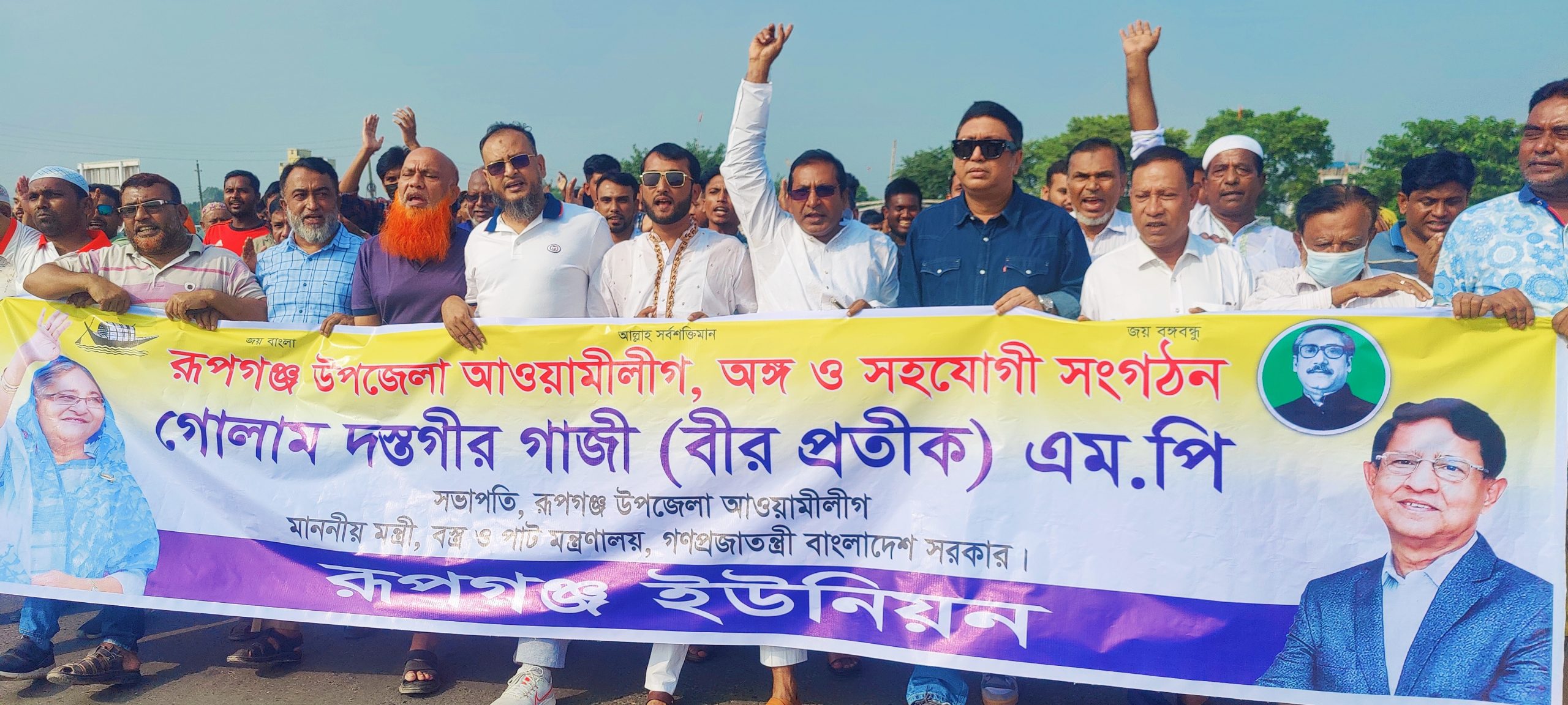 স্টাফ রিপোর্টার ঃ বিএনপি জামাতের হরতাল অবরোধের নামে নৈরাজ্যের প্রতিবাদে নারায়ণগঞ্জের রূপগঞ্জে বস্ত্র ও পাট মন্ত্রী গোলাম দস্তগীর গাজী (বীর প্রতীক) এমপির নির্দেশনায় সদর ইউনিয়ন আওয়ামিলীগ ও সহযোগী অঙ্গ সংগঠনের উদ্যোগে শান্তি মিছিল ও সমাবেশ অনুষ্ঠিত হয়েছে।