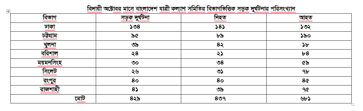 বাংলাদেশ যাত্রী কল্যাণ সমিতির পর্যবেক্ষণ মতে, অক্টোবর মাসে সড়ক দুর্ঘটনার উল্লেখযোগ্য কারণসমূহ: