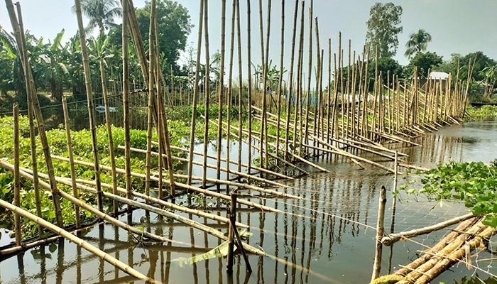 নিজস্ব প্রতিবেদক: পাবনার সাঁথিয়ায় কাগেশ্বরী নদী ও পাউবো’র পানি নিষ্কাশন খালে ৪-৫ টি স্থানে অবৈধভাবে বাঁশের বেড়া ও সুতিজাল দিয়ে মাছ শিকার করায় বিলের পানি প্রবাহের গতিকে বাধা সৃষ্টি করছে। ফলে বিলের পানি বের হচ্ছে মন্থর গতিতে। ফলে কৃষকের বীজতলা তৈরিসহ রবি মৌসুমে হাজার হাজার হেক্টর জমিতে পেঁয়াজ, মরিচ, রসুন, শরিষার আবাদ ব্যাহত হওয়ায় আশঙ্কা করছেন এলাকার কৃষকরা।