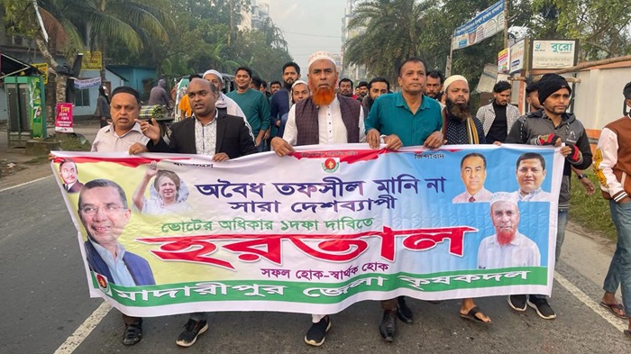 নিজস্ব প্রতিবেদকঃ আগামী দ্বাদশ জাতীয় সংসদ নির্বাচনের তফসিল ঘোষণার প্রতিবাদে ও আওয়ামী লীগ সরকারের পদত্যাগের ১ দফা দাবিতে বাংলাদেশ জাতীয়তাবাদী দল-বিএনপির ডাকা হরতালের সমর্থনে বিক্ষোভ মিছিল করেছে মাদারীপুর জেলা কৃষকদল।