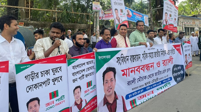 মানববন্ধনে বক্তব্য রাখেন জনপার্টির চেয়ারম্যান হৃদয় চৌধুরী, মহাসচিব মো: সালাউদ্দীন সোহাগ, অর্থ বিষয়ক সম্পাদক মো: ইকবাল হোসেন, প্রচার ও প্রকাশনা বিষয়ক সম্পাদক মো: মুনতাসির মামুন, কৃষি বিষয়ক সম্পাদক এস এম আশরাফুল ইসলাম, ত্রাণ ও দুযোর্গ বিষয়ক সম্পাদক মো: বুলবুল ইসলাম, শ্রম বিষয়ক সম্পাদক মো: শাকিল প্রধান, শিক্ষা ও মানব সম্পদ বিষয়ক সম্পাদক সোহাগ তরফদার, সমাজকল্যাণ সম্পাদক মো: মেহেদী মাসুদ প্রমুখ।