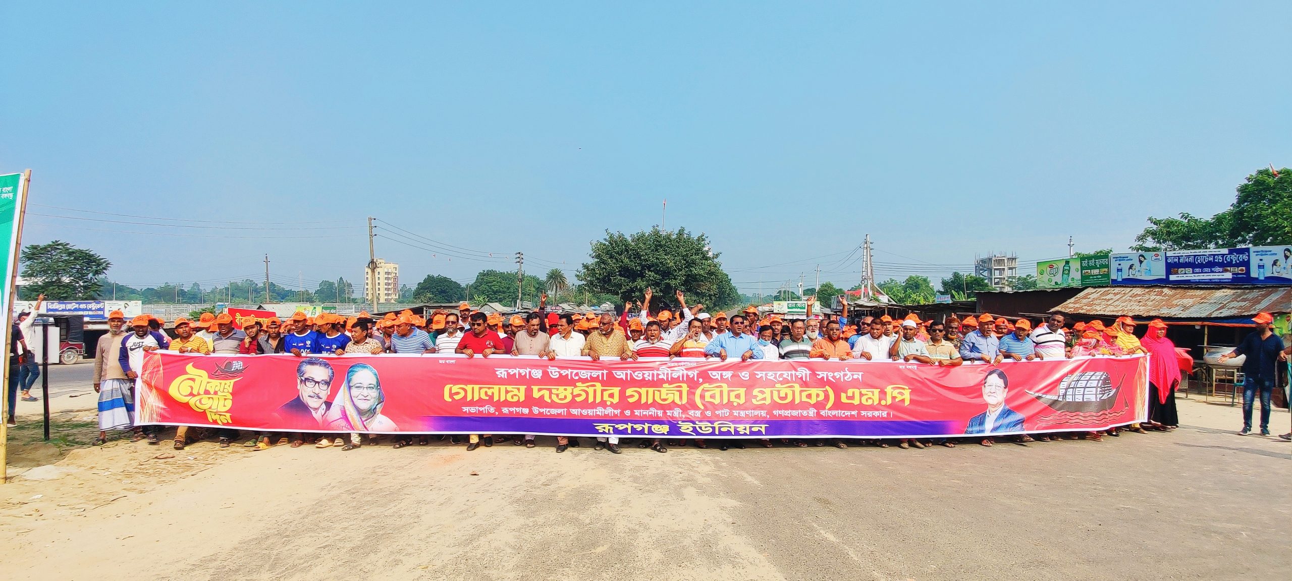 স্টাফ রিপোর্টার: বিএনপির জামায়াতে হরতাল অবরোধের প্রতিবাদে নারায়ণগঞ্জের রূপগঞ্জে বস্ত্র ও পাট মন্ত্রী গোলাম দস্তগীর গাজী (বীর প্রতীক) এমপির নির্দেশনায় শান্তি মিছিল ও সমাবেশ অনুষ্ঠিত হয়েছে।